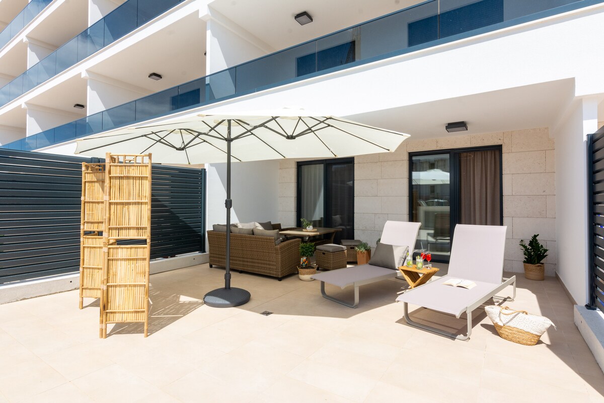 Brandneue Wohnung in der Nähe des Strandes gelegen. Dekoriert im modernen Stil mit allen notwendigen Geräten (2 Fernseher, 2 Klimaanlagen, Waschmaschine, Föhn, Geschirrspüler, Kühlschrank, Induktionsherd, Backofen, Kaffee-/Teemaschine, Safe, Moskitonetz). Sie können einen riesigen Terrassenplatz (Gartenmöbel, Strandliegen) genießen. Die Wohnung verfügt über kostenlose Privatparkplätze in der Garage.