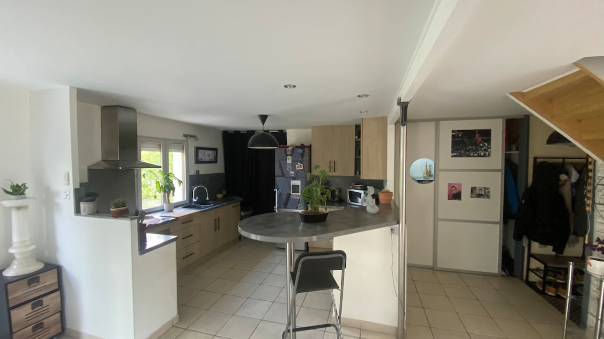Cette spacieuse maison entre ville et campagne entièrement refaite à neuf est idéale pour des moments inoubliables en famille ou entre amis : salon-séjour avec canapé et télévision, grande table à manger, cuisine équipée, 4 chambres dont 3 avec lits doubles et 1 avec lit simple, salle d’eau avec douche italienne, WC indépendant, jardin et parking privé. Lits faits à l’arrivée. Venez vous relaxer dans un cadre verdoyant malgré une proximité de la rue. Arrivée et départ avec la propriétaire.
