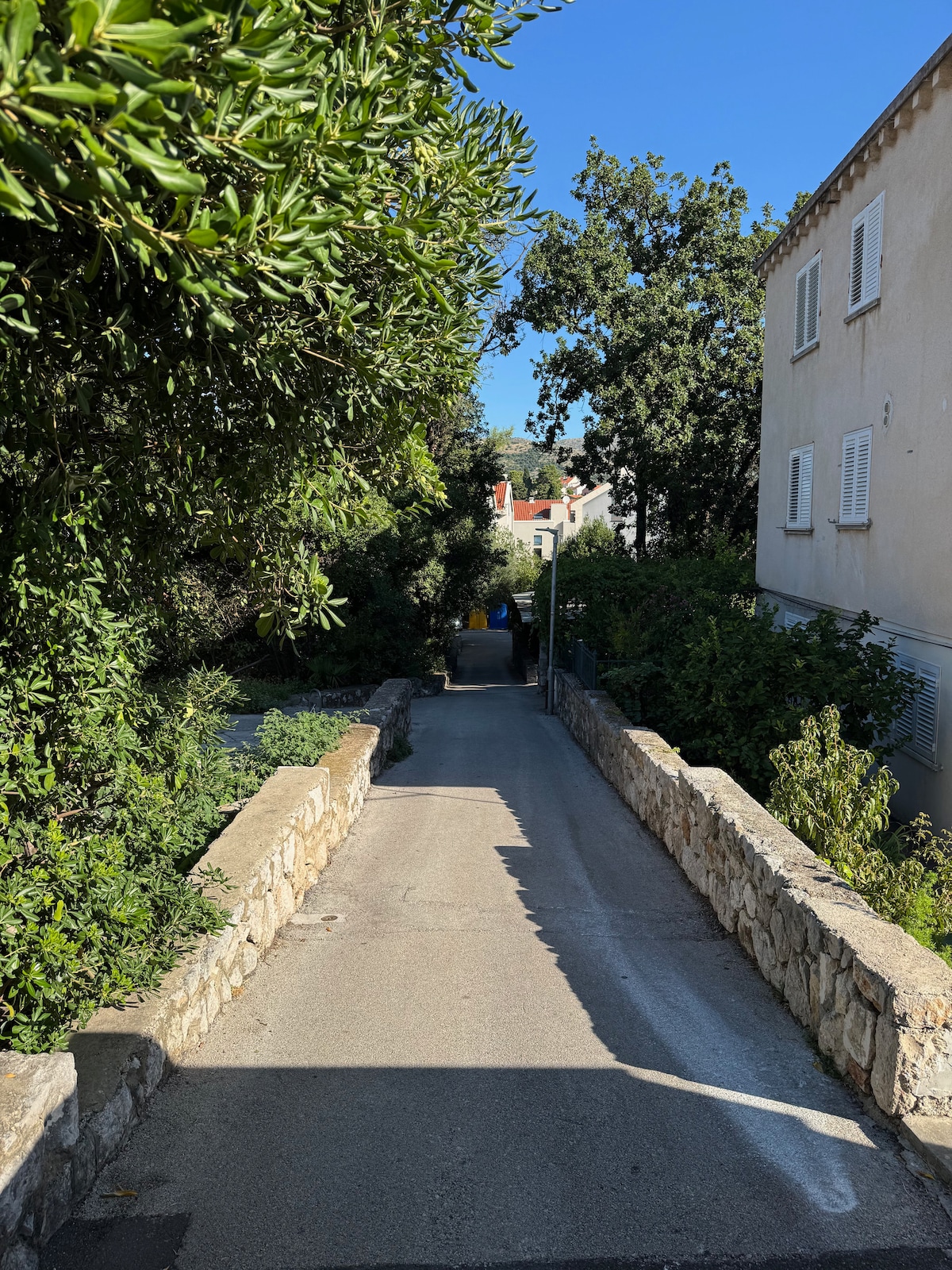 Enjoy long walks by exploring the nearby beaches and walking trails. Later, look out to sea from the spacious terrace and plan the next day's trips. The airy interior features a floating staircase, walk-in rain showers, and underfloor heating. Prepare yourself a delicious meal in a fully equipped kitchen. Interesting two-floor interior consists of a living room, kitchen and a dining room combined, two bedrooms with own bathrooms, and a wide terrace with a sea view. The apartment is very spacious and can comfortably host five adults. Each bedroom has a double bed, closet and a working desk with a wireless charging lamp. Extendable corner set sofa in the living room is suitable for 1-2 persons, while the central dining table is extendable for six. Our guests can easily relax in the apartment as it offers three smart LED TVs, air-conditioning, underfloor heating, Wi-Fi, fully functional kitchen equipped with a dishwasher, microwave, oven, kettle, coffee machine, and an extensive selection of kitchen utensils. Spacious terrace is perfect for relaxation on four loungers, for having early breakfast or a romantic dinner while enjoying the sea view, and the scent of the sea, pine and cypress trees. To our dear future guests, we are fully at your disposal for any question or help you might need. We will certainly do our best to make your vacation pleasant and delightful. Beaches, walking trails and parks are all close, together with shops, market, cafes, and bars. Located on Lapad peninsula, in a quiet part of Dubrovnik, dining recommendations include a fish restaurant, also called Orsan, in front of the apartment. The apartment is approximately 200 m away from the bus stop from which the bus number 6 will take you to the Old Town. There is a public parking space in front of the apartment, which is partly free of charge. Beaches, walking trails and parks are all close, together with shops, cafes and bars. Located on Lapad peninsula, in a quiet part of Dubrovnik, dining recommendations include a fish restaurant, also called Orsan, in front of the apartment. Local market is very close where you can find delicious groceries for your meal.