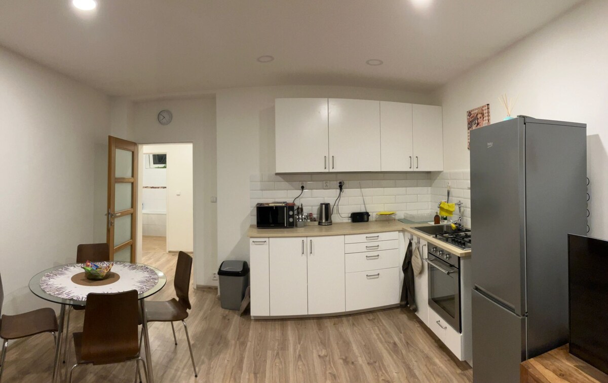 Mieten Sie eine moderne 3 + 1 Wohnung in toller Lage🏡 Parkplatz 2 Minuten von der Unterkunft entfernt🅿️ Schlafzimmer, Wohnzimmer, Küche, Esszimmer, Badezimmer, Loggia. 🛋️ Wohnzimmer mit Smart-TV (Netflix, OnePlay, Spotify) ⚡️ Schnelles WLAN in der gesamten Wohnung 🍳 Voll ausgestattete Küche (Herd, Kühlschrank, Mikrowelle, Geschirr) 🪞 Badezimmer mit Handtüchern, Duschgels, Shampoos, Rasierern, Zahnbürsten und Interdentalhilfen 🧴 Cremes und Parfums sind ebenfalls erhältlich 💼 Arbeitsbereich – elektrisch verstellbarer Tisch, ideal für das Homeoffice