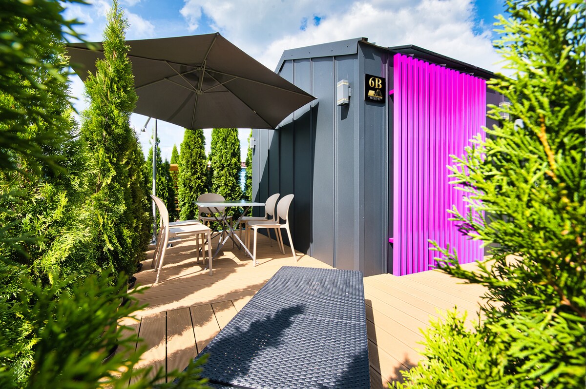 Das Ferienhaus im Hotelzimmer-Stil verfügt über eine Terrasse mit Blick auf Achterbahnen, wo wir einen Grill haben, und einen Tisch mit Stühlen. Das ausgewählte Haus verfügt über ein privates Badezimmer. Im Preis enthalten ist ein Aufenthalt von bis zu 2 Personen. Es gibt keine Möglichkeit, ein zusätzliches Zustellbett zu kaufen. Für deinen Komfort bietet das Ferienhaus Platz für 2 Personen. Gegen eine Gebühr kannst du ein romantisches Paket organisieren - für weitere Informationen laden wir dich ein, dich an die Rezeption der Unterkunft zu wenden, um weitere Informationen zu erhalten.
