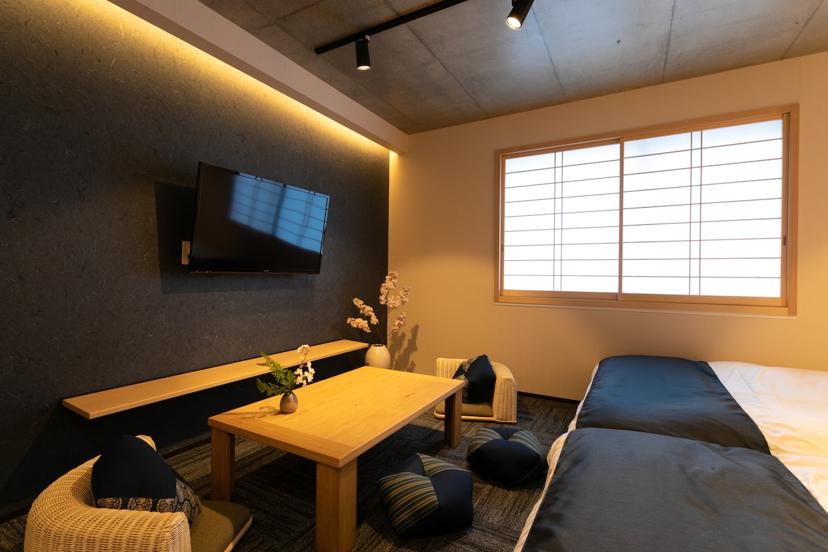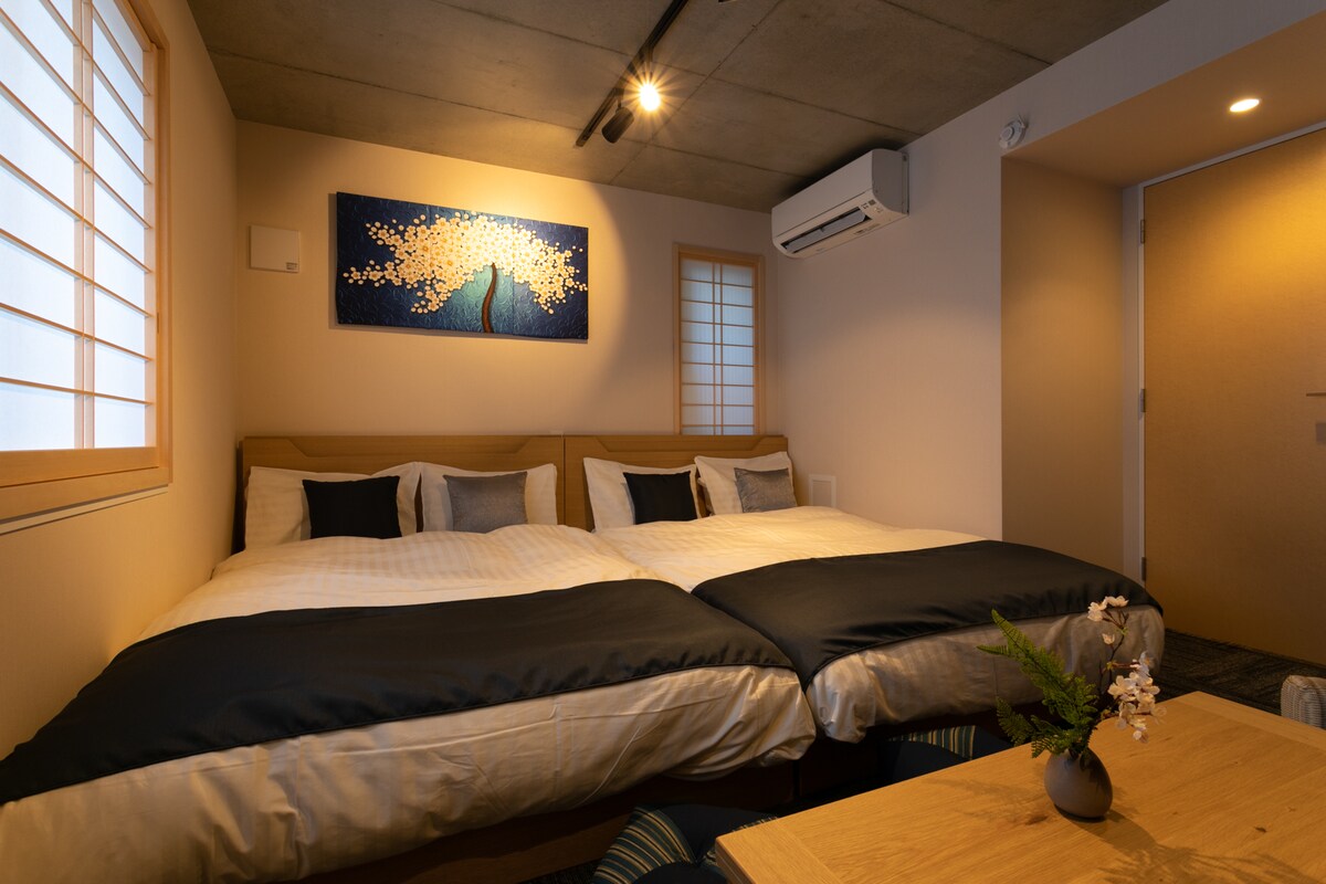 Das im Dezember 2019 neu erbaute Zimmer ist im modernen/japanischen Stil eingerichtet und bietet einen komfortablen Raum, in dem du Zeit verbringen kannst. Es gibt viele Zimmereinrichtungen, wie eine Küche und eine Waschmaschine für Langzeitgäste, einschließlich Familien und Geschäftsleute. Obwohl sich der Raum ungewöhnlich anfühlt, können Sie hier Zeit verbringen und den Raum praktisch nutzen. Das Zimmer verfügt über zwei Doppelbetten und bis zu 4 Gäste können im Zimmer wohnen. (Es ist ein 25-Zimmer, der für 2 Gäste ideal ist.)