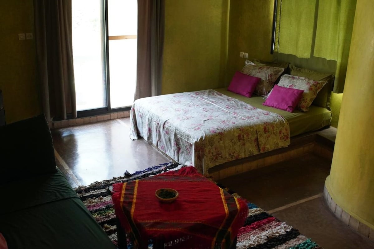 Welcome to your peaceful mountain getaway in the beautiful Ourika Valley, just a short drive from Marrakech. This cozy apartment blends traditional Amazigh charm featuring handcrafted decor and breathtaking views . • Large panoramic windows with mountain and garden views • Traditional Amazigh seating and handmade rugs • A dining area with a rustic touch • A fireplace for cozy evenings 🛏️ The apartment comfortably hosts up to 4 guests and is perfect for couples, families, or friends.