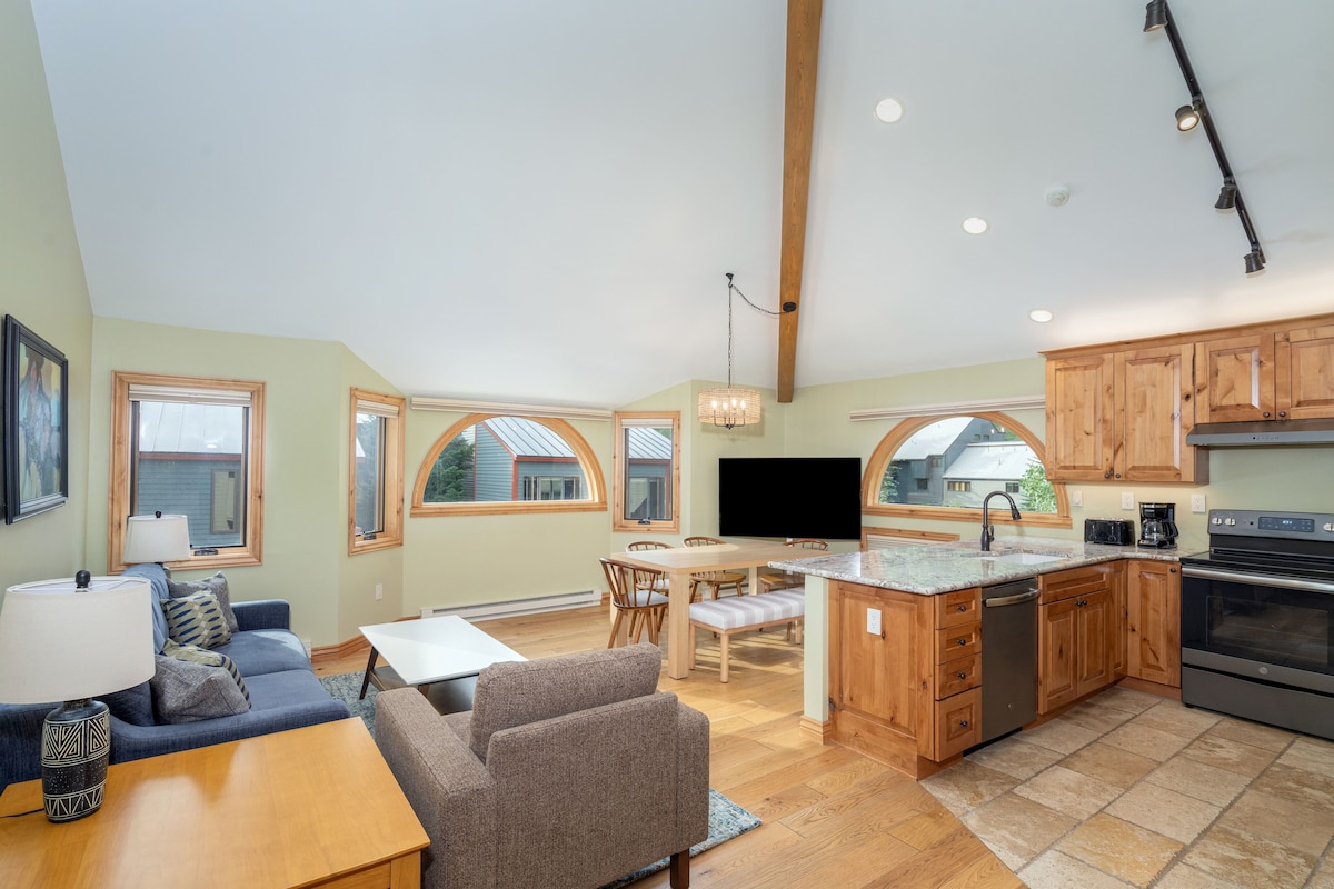 Elegant renoviert! 1 Bett, 1 Bad Wohnung im ersten Stock in der Stadt Telluride. Die Eigentumswohnung bietet einen Blick auf die Berge mit schillerndem Alpenglow. San Miguel River und Trail sind nur wenige Meter von der Haustür entfernt. Die Küche ist gut für Gruppen ausgestattet, die gerne kochen und unterhalten. Das Wohnzimmer verfügt über ein Sektionssofa, einen großen Smart-TV und ein Premium-Soundsystem. Alle neuen Küchengeräte mit Waschmaschine und Trockner. Das Badezimmer konkurriert mit dem eines Spas! Pool und Whirlpool sind für die Saison 6/1 geöffnet!