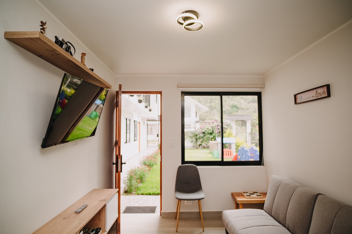 Disfruta nuestro Mini Depa de 2 dormitorios con Kitchenette full equipado, Wifi de alta velocidad Starlink y lavandería compartida. A 9 cuadras de la plaza de armas en urbanización de calles afirmadas, NO ESTAMOS EN EL CENTRO pero si cerca. Vista a las montañas y valle, ideal para familias, parejas o amigos que buscan la combinación perfecta de tranquilidad, confort, hermosas vistas al campo pero a un paso del centro de Oxapampa y a un precio razonable. ¡Reserva hoy y crea recuerdos imborrables!