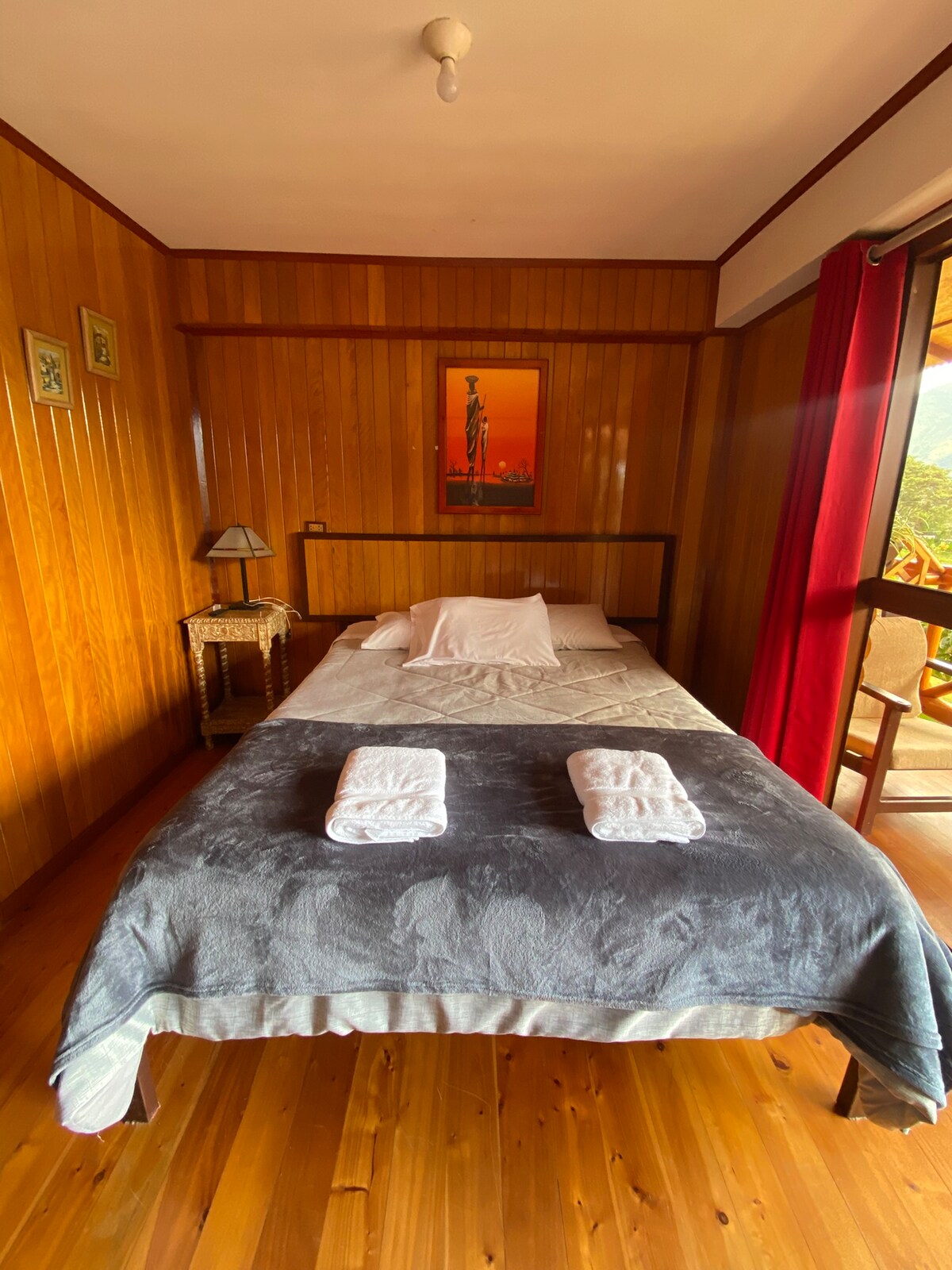 Habitación matrimonial cómoda en hotel tranquilo de Oxapampa, ubicada a solo 5 minutos de la Plaza de Armas. Tiene 1 cama de 2 plazas y 1 de plaza y media. Incluye baño privado, TV y wifi. Los huéspedes pueden usar cocina compartida, estacionamiento gratuito dentro del hotel, área de fogata, parrilla y juegos para niños. Alojamiento pet friendly y ambiente familiar, perfecto para descansar y disfrutar la naturaleza de Oxapampa.