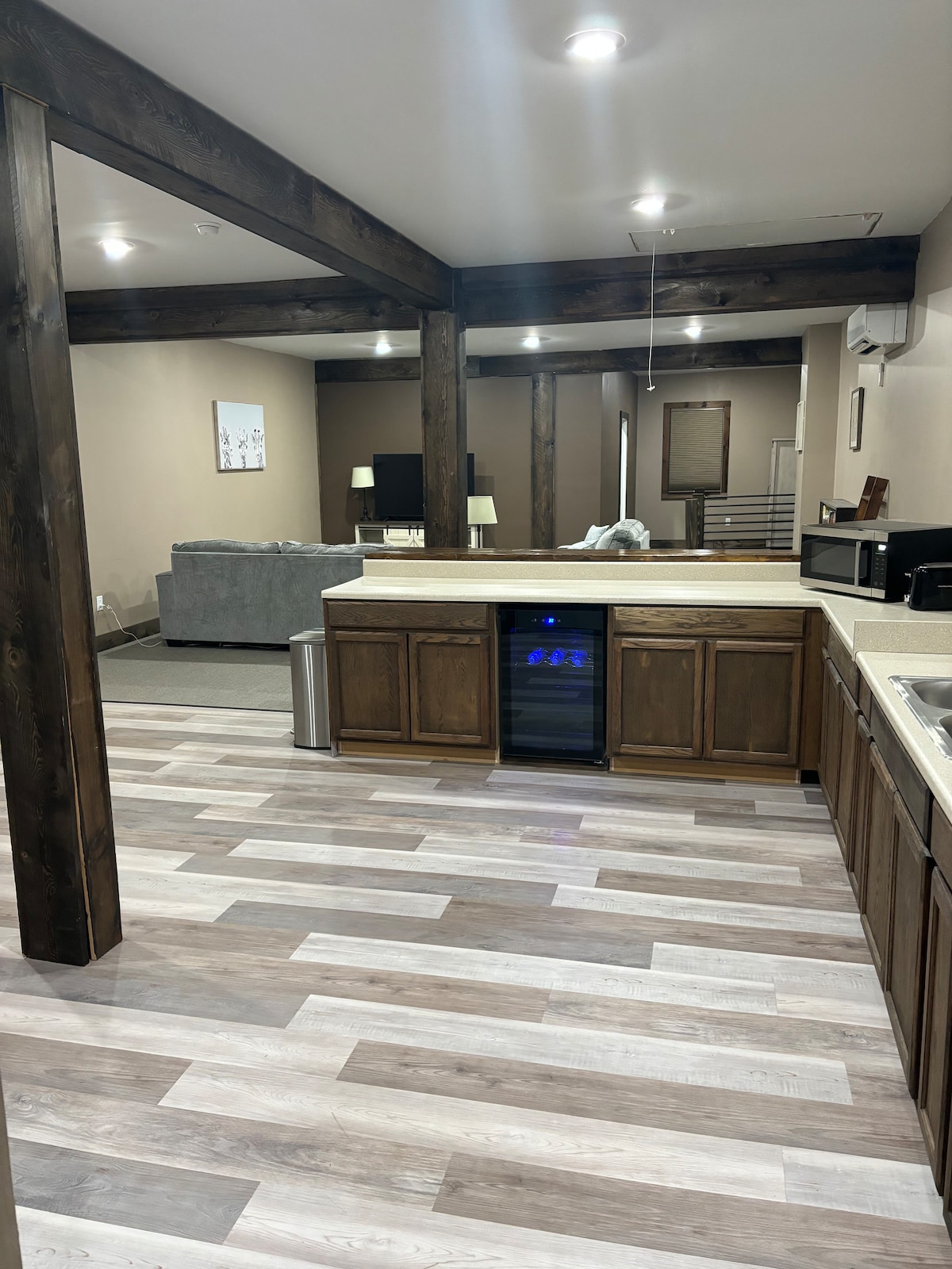 This recently improved riverfront cabin, has a style all its own. Open entertainment space extends on to the 40 ft long deck. The many windows and doors allow nature in, complementing the locally sourced live edge countertops in the kitchen. Beautiful views are seen of the lush landscaping, river and distant mountain, from every room. The kitchen offers all ammenities, such as a dishwasher, large french door style refrigerator, and a ton of storage along with ample countertops.