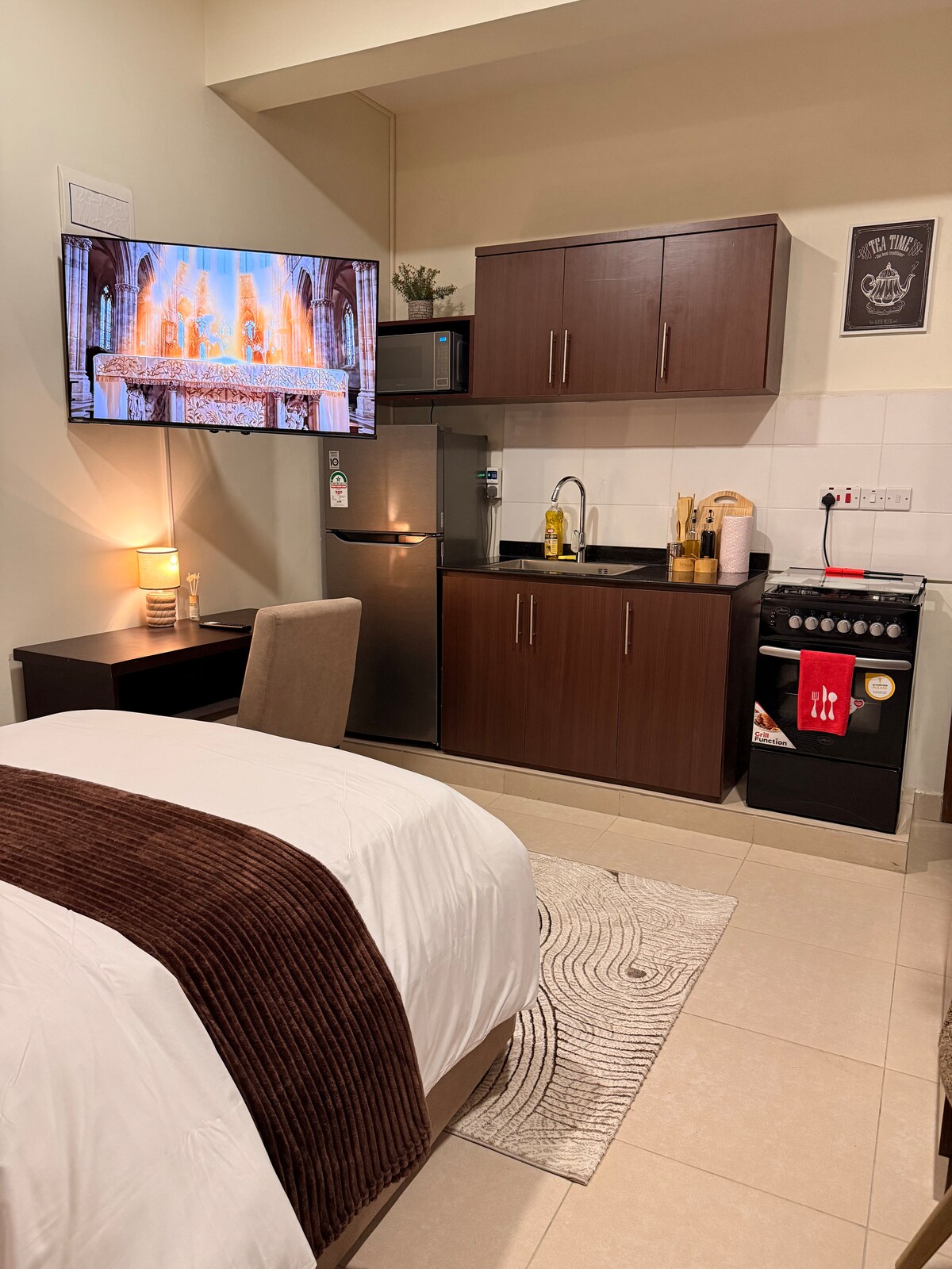 Whether visiting Dar es Salaam for business or leisure, our apartment offers a sophisticated city escape where comfort, privacy, and convenience meet. This elegant 1-bedroom residence is set in a prime, serene neighborhood near Masaki, Msasani, CBD, and Upanga—just 1 minute from Dar Village Mall and Kuku Kuku Bar & Restaurant. Enjoy a cozy bed, private bathroom, 32” Smart TV, sleek workstation, modern lighting, and ample storage—perfect for relaxing, working, or exploring the city with ease.