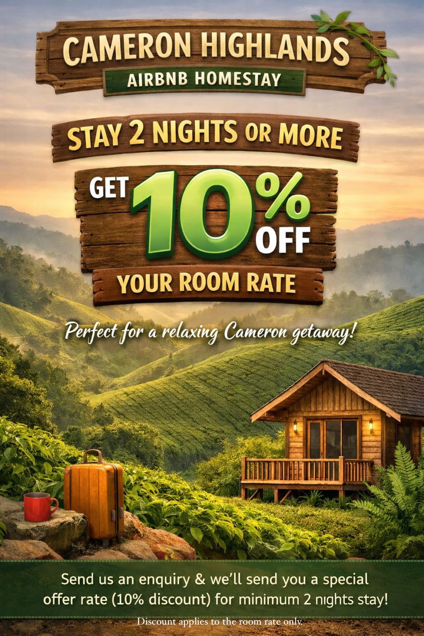 Wenn du den Staus in den Touristenmassen des Cameron Highlands entfliehen möchtest, ist es super schön, zurückzukommen, zu chillen und die Ruhe bei uns zu atmen. Wir befinden uns direkt gegenüber vom Cameron Tea Valley — ja, du hast also diesen schönen Blick auf die Teeplantage direkt vom Balkon. Perfekter Ort für deinen morgendlichen Kaffee oder abendliche Chill-Session. Gleich unten gibt es Café, Dobi, plus 7-Eleven und 99 Speedmart, wenn du ein paar schnelle Lebensmittel brauchst. Alles ist einfach, kein Stress!!