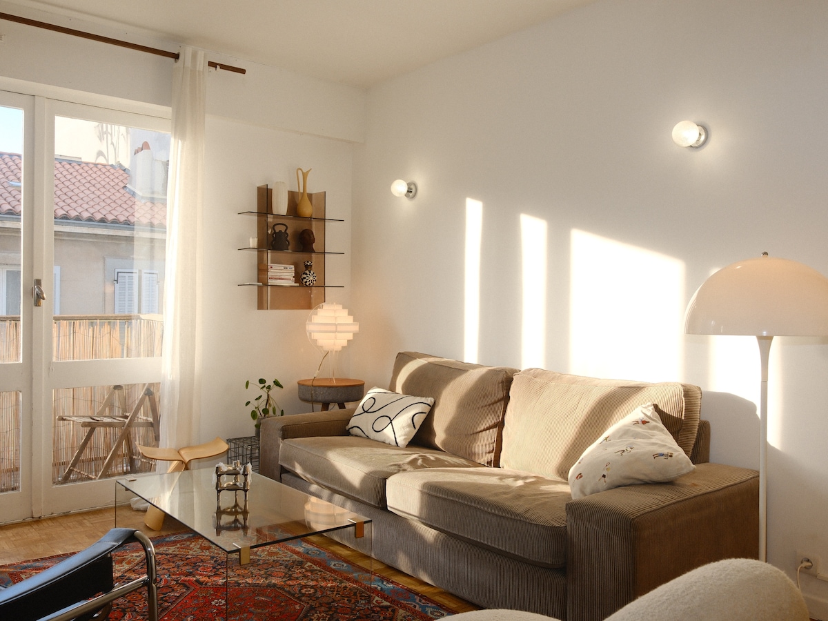Direkt neben der Plaine und dem Cours Julien, 10 Minuten zu Fuß vom Bahnhof Marseille Saint-Charles und dem Alten Hafen entfernt, bietet unsere Wohnung mit Blick auf Marseille den ganzen Tag über viel Licht. Die Sonne geht auf der Hügelseite auf, auf unserem Balkon, wo es schön ist, das Frühstück einzunehmen. Man sieht sie von der Küche aus untergehen, auf der Meerseite. Der Balkon ist über eines der beiden Schlafzimmer und über das Wohnzimmer zugänglich, das aus einem Wohnbereich und einem großen Esstisch besteht.