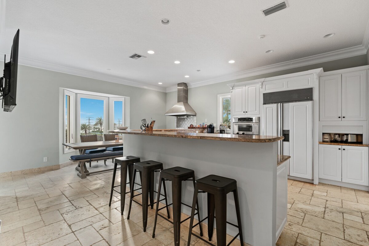 Willkommen in der Oase Palmasis! DER ultimative Urlaub in Palm Coast! Entspannen Sie sich in einem privaten Pool, kochen Sie in einer Gourmet-Küche im Innen- und Außenbereich und genießen Sie den Zugang zum Kanaldock Entspanne dich im geräumigen Wohnzimmer mit einem 86-Zoll QLED-Fernseher und Surround-Sound oder veranstalte einen Filmabend mit der Popcorn-Maschine. Platz für 10 Personen, mit 3 Badezimmern und 5 Betten, darunter eine luxuriöse Master-Suite. Beobachte Delfine oder Seekühe vom Dock aus und genieße die Grills auf einem 12 Fuß langen Outdoor-Setup mit einem Pizzaofen. Reine Glückseligkeit erwartet dich!