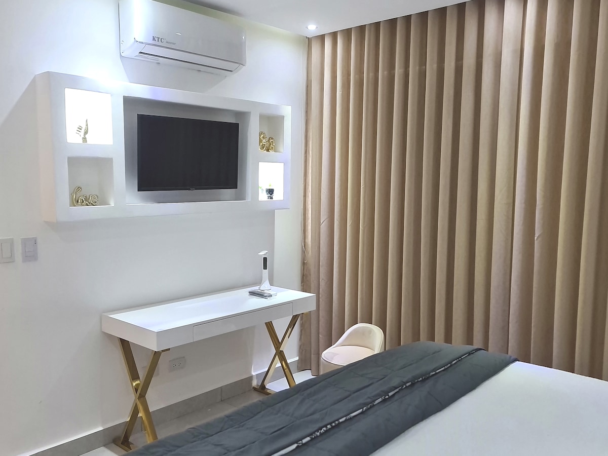 „Moderne Wohnung in einer Luxus-Wohnanlage, in einer sehr sicheren Gegend. Die Wohnung verfügt über ein Bett, einen Kühlschrank, einen Herd, einen Toaster, eine elektrische Kaffeemaschine, eine Waschmaschine, Kochutensilien, zwei (2) Klimaanlagen im Wohnzimmer und im Schlafzimmer. Ein überdachter Parkplatz und zwei Fernseher mit YouTube- und Netflix-Diensten.“ Die Wohnanlage verfügt über eine elektrische Tür, einen beeindruckenden sozialen Bereich, einen Fitnessraum und einen Tagungsraum.