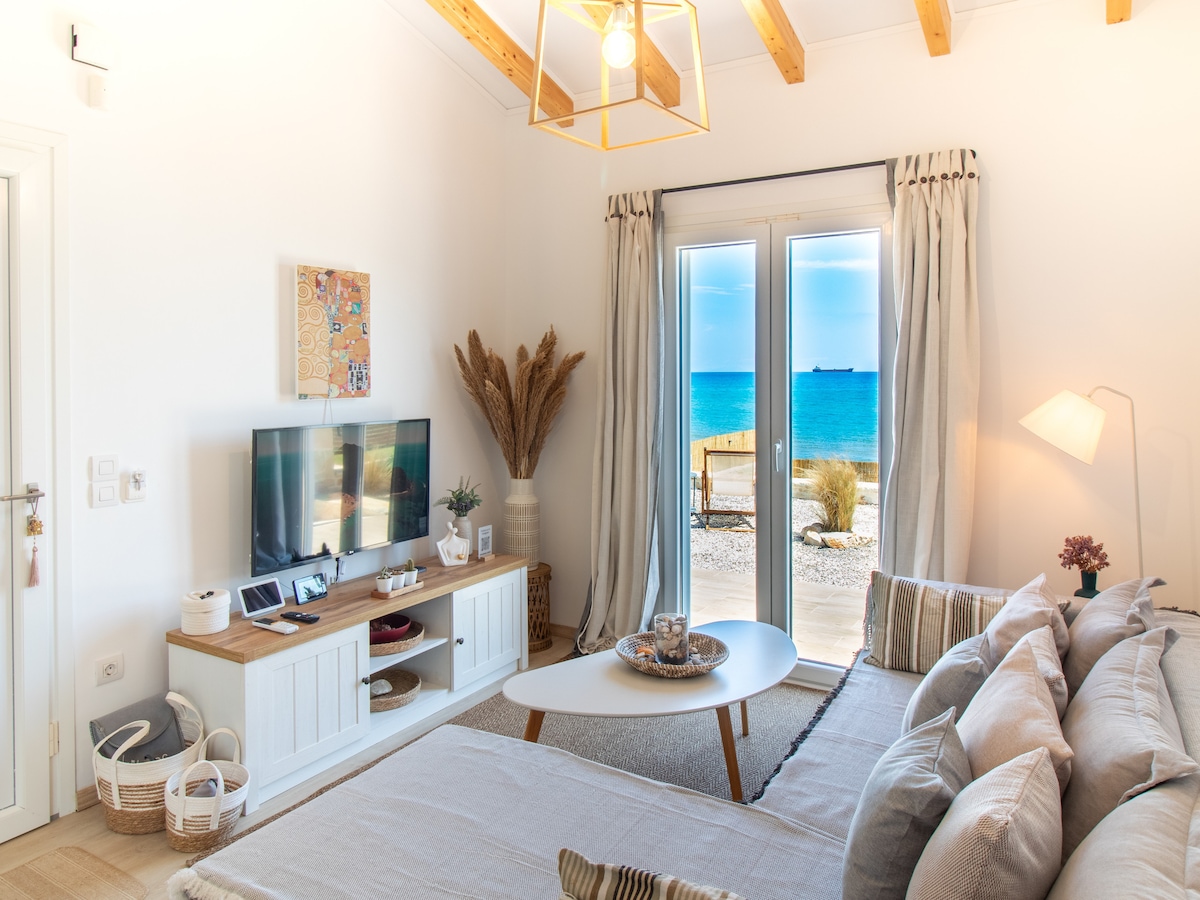 Sandy Pines Villas: Athina Strandvilla. Ein privater Rückzugsort, wo Pinien auf das Ionische Meer treffen. Die Athina Villa (82 m²) bietet den seltenen Luxus eines privaten Tors, das direkt zum Strand von Alykes führt. Keine Straßen, die man überqueren muss, keine Schuhe erforderlich. Ideal für Familien, die authentischen Luxus suchen. Genießen Sie Ihren Morgenkaffee mit dem Rauschen der Wellen, einem privaten Garten und Tavernen im Dorf, die nur einen 5-minütigen Spaziergang entfernt sind.