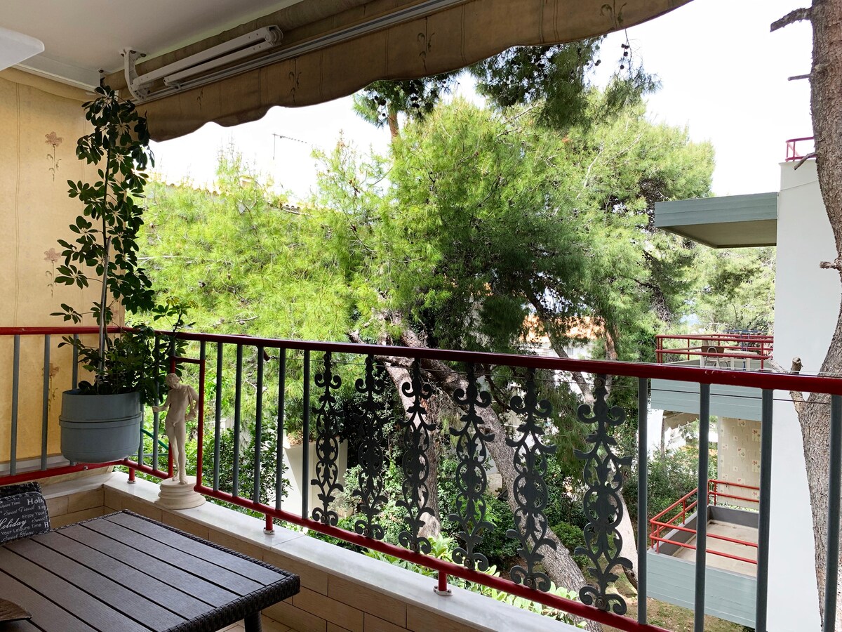 Panoramablick auf das Meer, in Strandnähe, zentral gelegen neben öffentlichen Verkehrsmitteln, Restaurants, Bars, Cafés, Supermärkten, Kinos und vielem mehr. Nur 20 Minuten vom Flughafen entfernt, in der Nähe von Athen. Geräumige und saubere Dachgeschosswohnung mit 2 Schlafzimmern