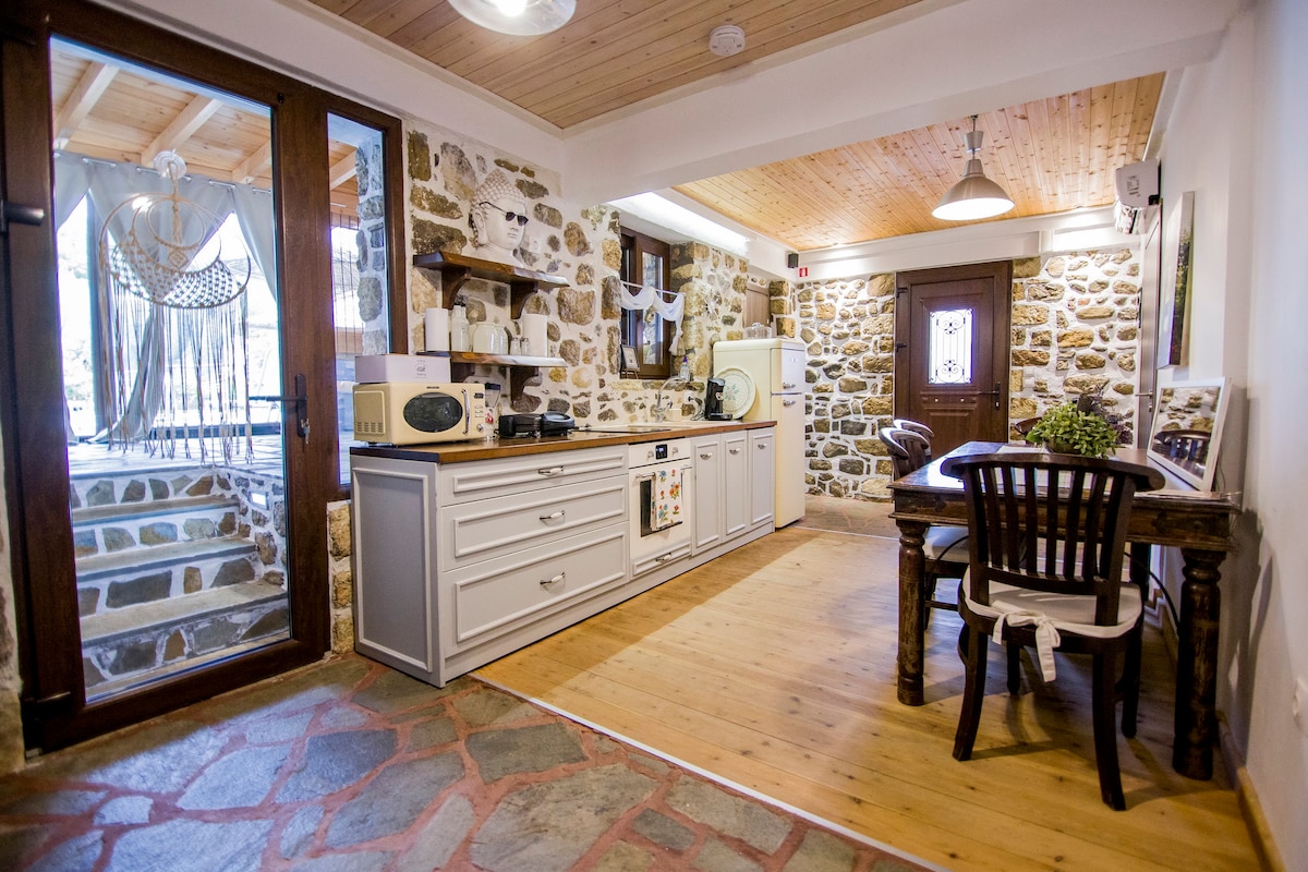 Αυτός ο κομψός χώρος διαμονής είναι ιδανικός για ομαδικά και οικογενειακά ταξίδια.Ομορφη αυλή με πολλά λουλούδια τελείως περιφραγμένη για ιδιοτηκότητα, κιόσκι μπάρμπεκιου και λειτουργικός ξυλόφουρνος Το κτήριο κατασκευάστηκε απο τους παπούδες μου το 1795. Ανακαινίστηκε πλήρως το 2010 με τις ίδιες ντόπιες πέτρες και ξυλεία καστανιάς απο το Αγιο Όρος