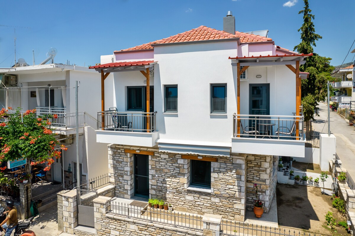 Hallo meine Freunde! Diese Wohnung ist der Hauptteil eines komplett renovierten traditionellen Einfamilienhauses von 80 qm. Es befindet sich im Zentrum des Dorfes, nur wenige Gehminuten vom alten Hafen von Limenaria entfernt und bietet einen einzigartigen Blick auf das malerische Palataki.