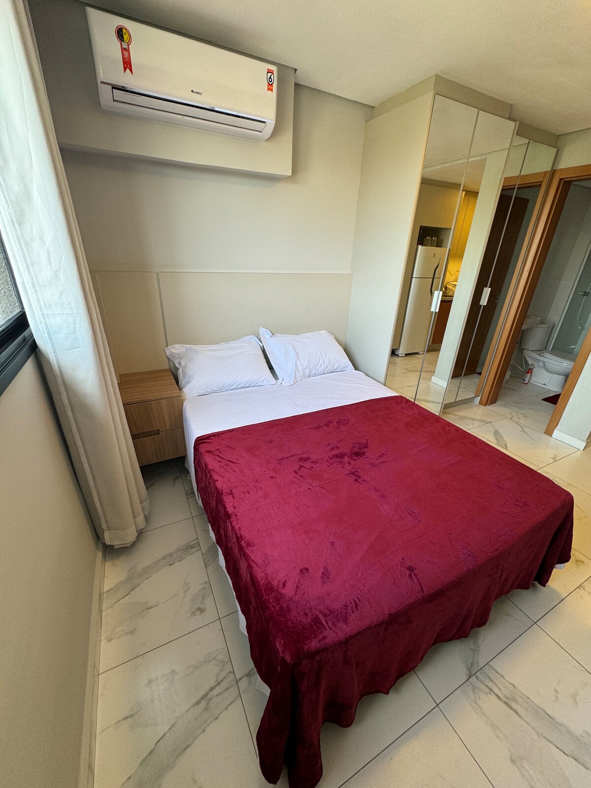✨ Studio novinho, moderno e mobiliado para sua estadia perfeita. Cama queen, tv smart 55 polegadas, microondas, fogão e ar condicionado. Cada detalhe foi pensado para oferecer praticidade, aconchego e estilo. Ideal para quem busca conforto, seja a trabalho ou lazer. Aproveite um ambiente agradável, com cozinha equipada, internet rápida e decoração moderna. Perto de tudo que você precisa para uma experiência incrível. Conta com lavanderia compartilhada e mercadinho. Nao tem estacionamento.