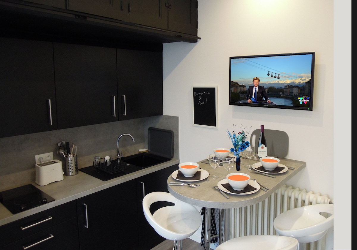 Lage Nr. 1: 5 Minuten zu Fuß vom Bahnhof, 8 Minuten von GEM, 3 Minuten von der berühmten Seilbahn, an den Toren des Hyperzentrums Willkommen in meiner Wohnung „die Seilbahn“, ideal für 6 Personen mit Klimaanlage Im 3. Stock mit Aufzug und Balkon eines Haussmann-Gebäudes kannst du während deines Aufenthalts die Postkarte von Grenoble von deinem Sofa aus bewundern... 80 m2 komplett renoviert, war es mir wichtig, seine Seele und seinen Charakter zu bewahren. Ich habe es arrangiert, damit du dich wie zuhause fühlen kannst.