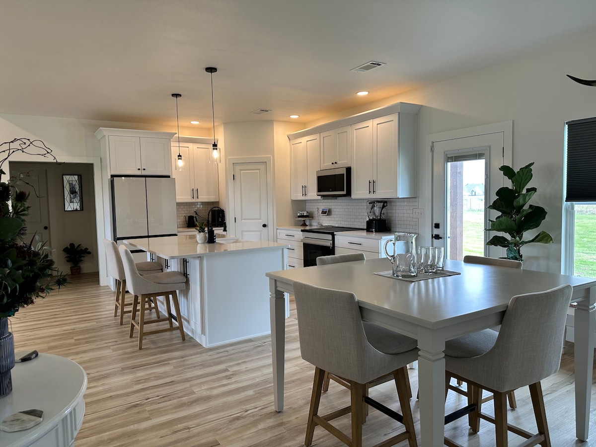 Forget your worries in this spacious and serene contemporary farmhouse complete with its own private pond. Escape the city to our peaceful cozy getaway. While y’all are here, enjoy the luxurious king bed, oversized spa-like shower and gather around the open and inviting family-style kitchen. Whether you’re relaxing in the hot tub listening to the sounds of nature or roasting s’mores by the fire pit you’re sure to enjoy the experiences this property has to offer!