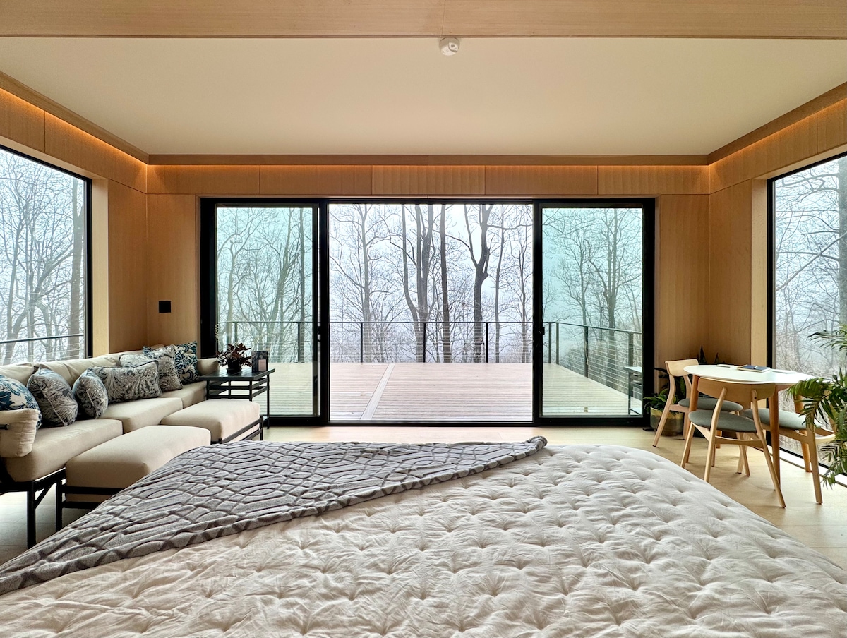 Das Doah House ist ein privater Rückzugsort auf einer Klippe auf dem Blue Ridge, mit weitem Blick über das Shenandoah Valley. Ein ruhiger Behälter für Ruhe und Beobachtung, das Tempo wird sanfter, geprägt von kleinen Ritualen: das Anzünden des Feuers, das Eintauchen in die holzbefeuerte Wanne, das Kaffeekochen von Hand. Das Wetter bewegt sich durch die Bäume und verändert das Licht, die Luft, den Klang. Jeder Tag fühlt sich anders an. Der Wald verändert sich, und du vielleicht auch.