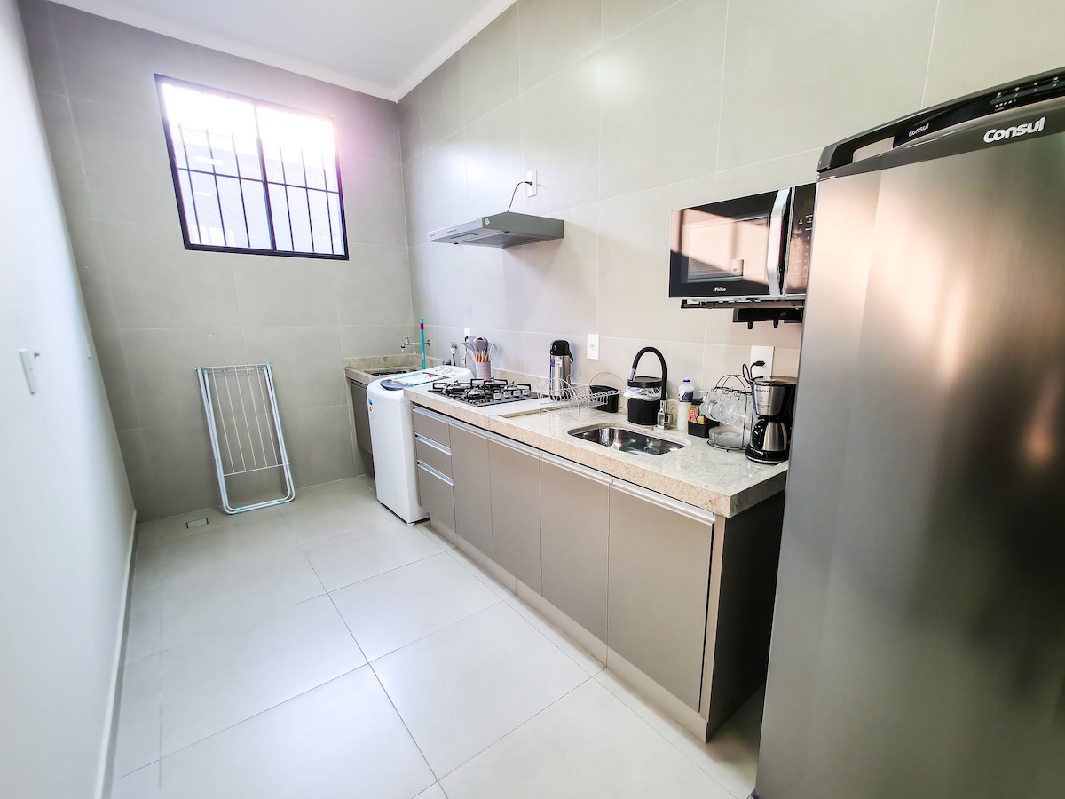 Ground floor apto in downtown Tanabi, ideal for up to 3 guests. Double bed, sofa, air conditioning, full kitchen, Smart TV, Wi-Fi, basic washing machine and quiet neighborhood. 📍 Downtown: near Hospital de Tanabi, Santa Casa de Misericórdia, Anhanguera University, Praça da Matriz and Parque da Cidade. 🅿️ Parking spot for small vehicles. 🔑 Smart lock — self check-in.