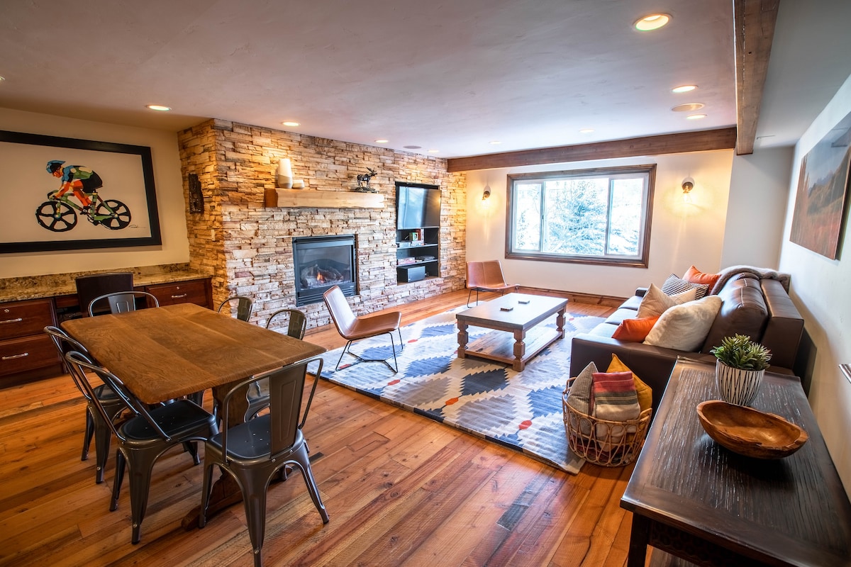 LAGE LAGE!! Keine Sorgen um den Verkehr oder die Reservierung/Bezahlung des Ski-Parkplatzes... Sie sind hier! Ski zu/von Quitn' Time, über die Stadttreppe zum Skifahren hinunter zur Skifahrerbrücke/Stadtlift. Schneller Wander-/Fahrradzugang zu den Sweeny & Mother Urban Trail Heads. Einfacher Zugang zur Main St, 2 Blocks hinter No Name Saloon und allen Festlichkeiten, Restaurants und Nachtleben. Alles weniger als 5 Minuten zu Fuß. Super süßes 1969 (ausgezeichnet) zeitgenössisches Ski-Chalet Apt auf der begehrten Upper Woodside Ave.