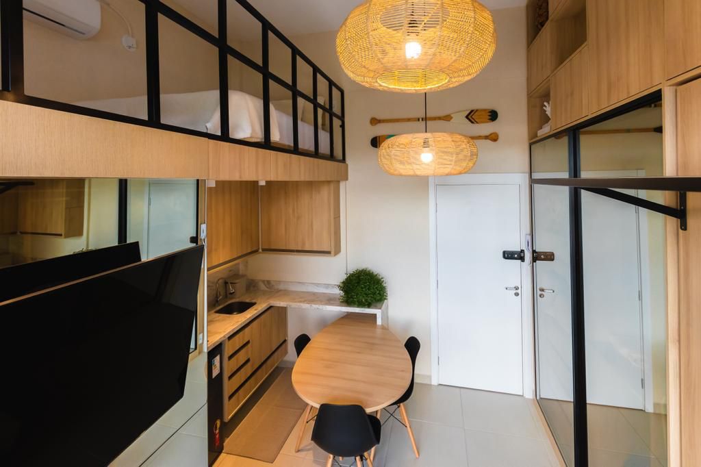 11 m² Loft, entworfen von der Architektin Lya Marty mit allem, was unsere Gäste brauchen, um sich wohl zu fühlen. Studio mit Fernseher, Minibar, Mikrowelle, Kaffeemaschine und allen Utensilien, um deinen Aufenthalt einzigartig zu machen. Es gibt Geschirr, Bettwäsche, Handtücher und Kopfkissen. Das Gebäude verfügt über einen eigenen Coworking-Space zum Arbeiten sowie eine Gemeinschaftsküche und einen Grillplatz. Komm und sei unser Gast