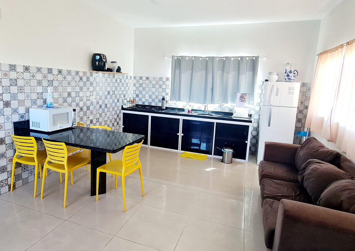 Apartamento completo e exclusivo Sala americana com cozinha completa " com vários itens de alimentação Ex: água mineral, café, chás, açúcar, sal, arros, óleo de soja, temperos etc" 1 Quarto grande com switch lugar para redes e colchonetes, lugar arejado, silencioso e tranquilo ao lado de uma praça ótima para caminhar