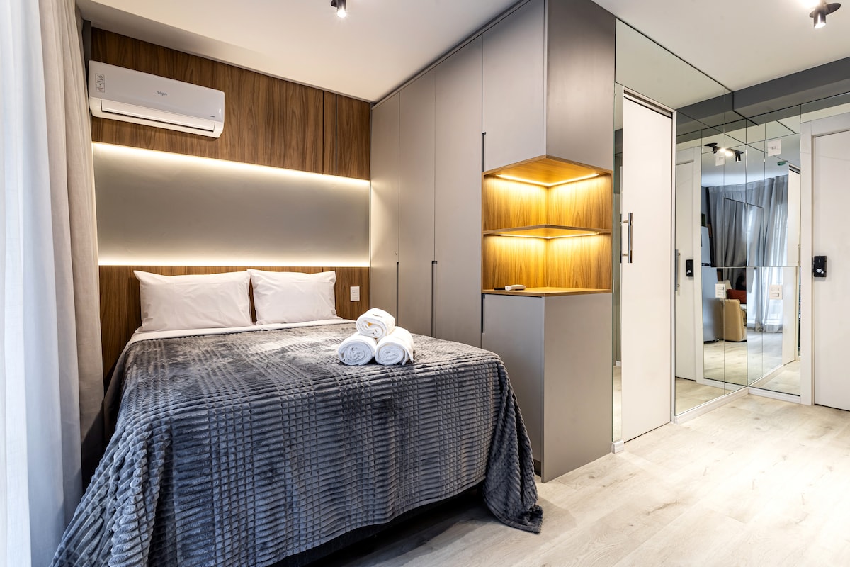 Conforto e praticidade Com uma localização privilegiada em São Paulo, esse estúdio é a escolha ideal tanto para quem deseja facilidade de locomoção para explorar a cidade em grande estilo quanto para relaxar após um dia intenso de trabalho. Equipados para atender suas necessidades em estadias curtas ou longas, oferecemos um ambiente completo e acolhedor. O condomínio conta com academia moderna, lavanderia e piscina. Além disso, oferecemos troca de roupa de cama e toalhas para estadias longas.