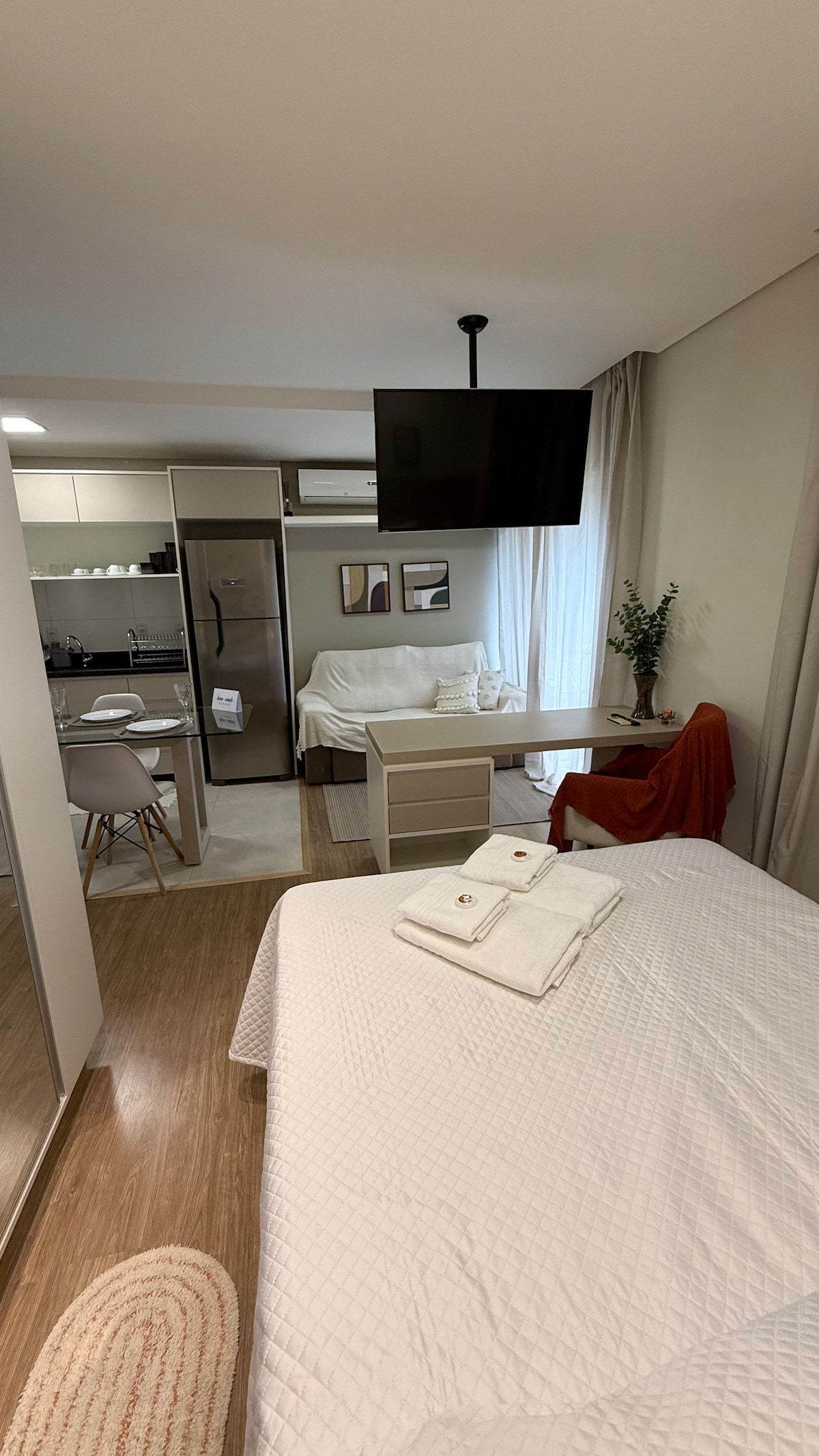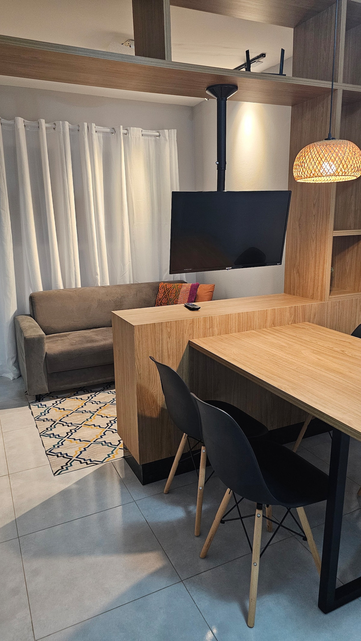 Aproveite uma estadia confortável neste cantinho preparado com muito carinho. O espaço de 1 quarto é moderno, iluminado e pensado para que você se sinta em casa. A sala conta com TV smart e um ambiente acolhedor p/ relaxar. A cozinha é equipada com o essencial e o quarto oferece cama confortável, roupas de cama, itens básicos e ar-condicionado. A localização é ótima, perto de tudo que você precisa. Cada detalhe foi preparado c/ cuidado para que sua experiência seja leve e agradável. 💛