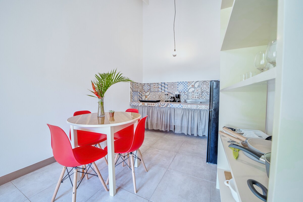 The apartment is located on Main Street in Playa Chiquita, the quietest and safest area of Puerto Viejo, a few meters from the most beautiful beach in the Caribbean. It is provided with: ✓ Queen bed ✓ Sofa bed ✓ A/C ✓ Kitchen ✓ Fiber Optic Wifi 50 Mb ✓ Private Patio ✓ Street Parking w/ Security Cameras A few meters away you will also find restaurants and supermarkets. The area is well connected and a few minutes by car from downtown, Punta Uva, Playa Cocles, and Manzanillo.