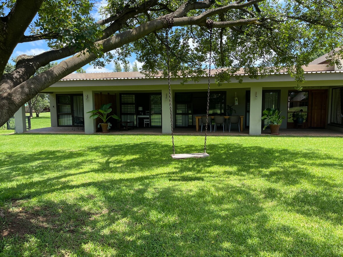 Ein voll möbliertes Haus zur Selbstverpflegung liegt 1 Stunde und 20 Minuten von Sandton entfernt, auf dem Land 12 km von Parys entfernt. Sie befindet sich in den Ausläufern des größten wilden Olivenwaldes der südlichen Hemisphäre im Weltkulturerbe Vredefort Dome. Es bietet einen atemberaubenden Blick auf den Fluss Vaal und spektakuläre Sonnenuntergänge. Das Haus verfügt über einen großen Garten, einen Swimmingpool, ein Trampolin und eine Braai-Ausstattung mit einem Lagerfeuer-Boma und einen Innenkamin. Ein herrlicher Familienurlaub.