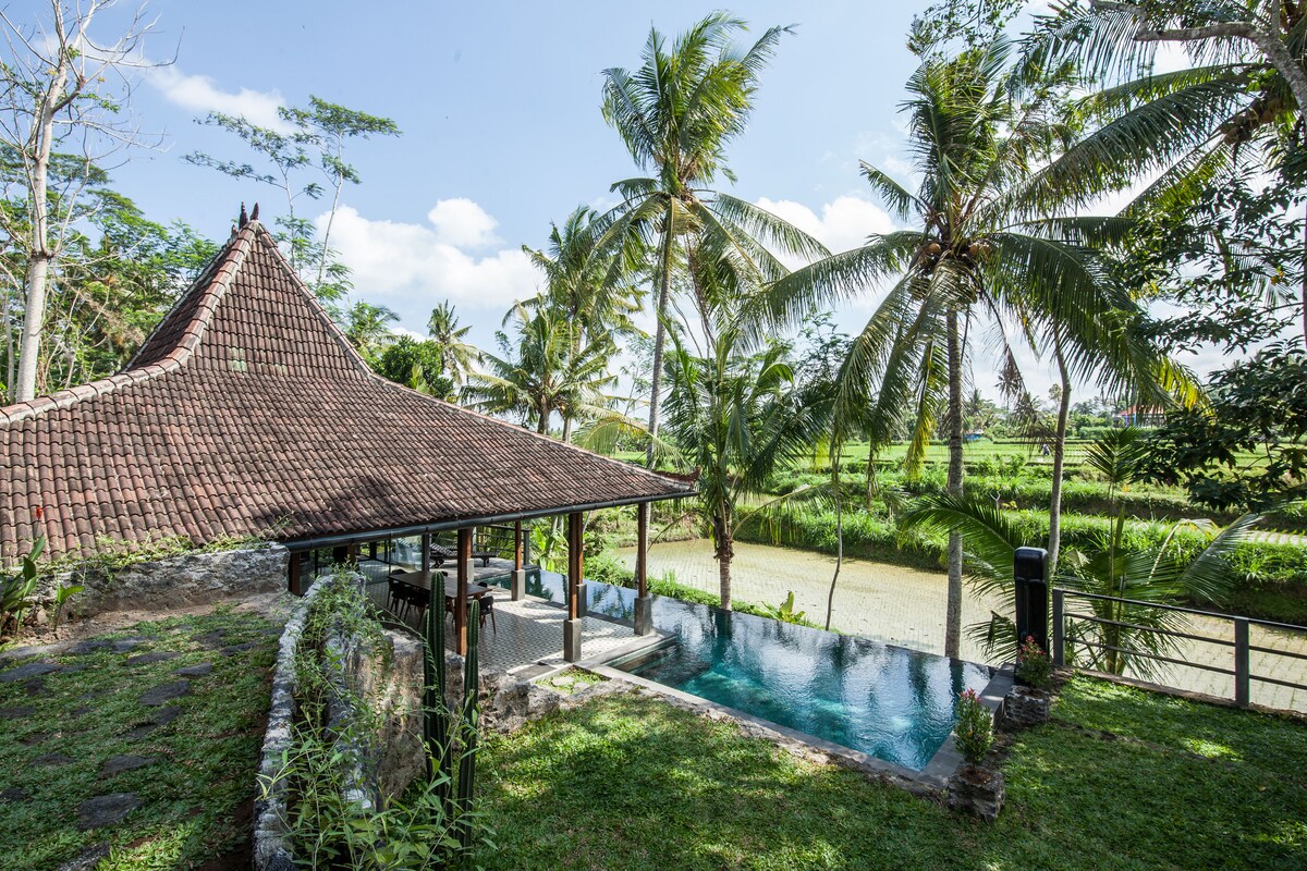 Ist eine private Suite im zweiten Stock mit zwei geräumigen Schlafzimmern mit Tageslicht, Wohnzimmer, Minibar und Küche. Große, erstaunliche private Terrasse an drei Seiten, umgeben von Reisfeld, Kokospalmen und wilder tropischer Atmosphäre. Kingsize-Bett (2 m x 2 m) mit Moskitonetz. Das Badezimmer verfügt über eine Badewanne, eine separate Dusche und eine Wasserstrahltoilette. Wir legen Wert auf Sauberkeit. Die Lage ist 3,5 km vom Zentrum Ubuds entfernt. Gemeinsamer Swimmingpool.