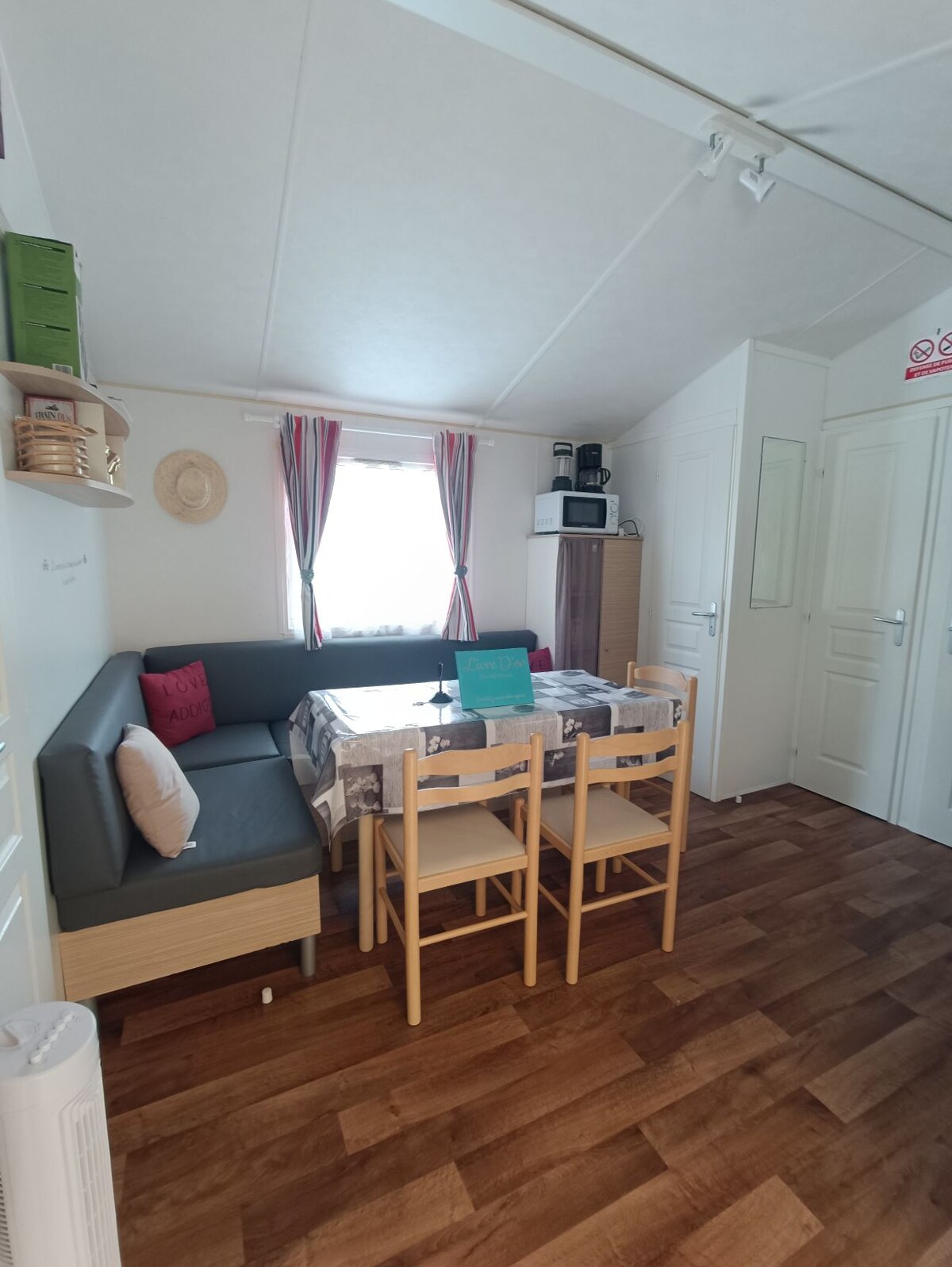 MOBIL-HOME confortable & cosy 40m2 au calme, VUE DEGAGEE devant et derrière CONTROLE ASSURE entre 2 locations, draps et serviettes jetables fournis LOCATION linge tissus SEJOUR CENTRAL , parties nuits aux extrémités 3 CHAMBRES, 1 lit double & 4 lits simples, 2 Salles d'eau & 2 WC CHAUFFAGE dans toutes les pièces, double vitrage, stores occultants et moustiquaires dans les chambres TERRASSE COUVERTE, parking privé ARRIVEE de 14 à 21 heures et départ 11 heures Sans SUPPLEMENT énergétique
