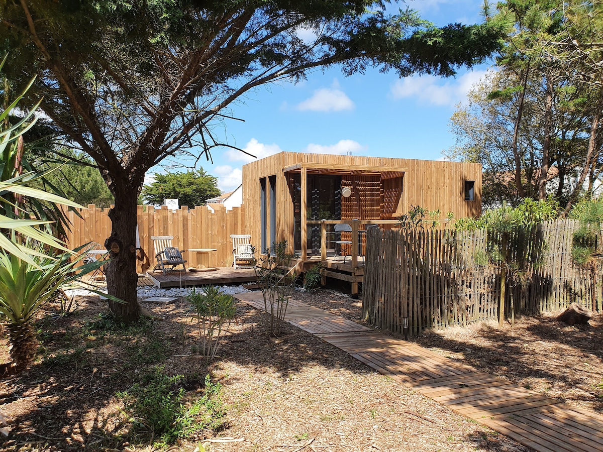 Gartenstudio Typ "Greenkub" von 20 m2 komplett ausgestattet. Direkter Zugang zum Strand. Privater Whirlpool, das ganze Jahr über Tag und Nacht nach Belieben zugänglich, mit Duschbad und WC. Die Lodge befindet sich am Ende unseres 1360 m2 großen Grundstücks ohne Gegenüber.