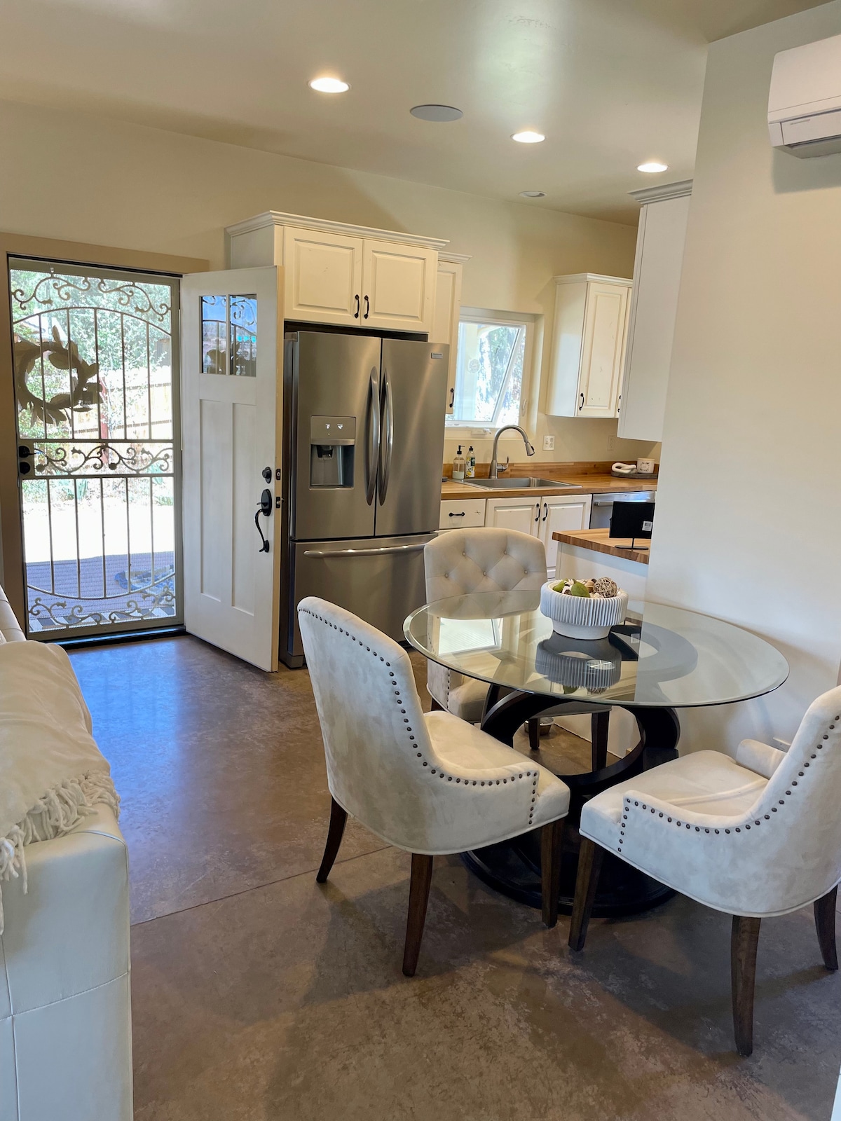 Mountain home outside the Phoenix area with cooler summer weather. Located in a small town near local bars, restaurants, and shops. Two bedrooms, one bathroom, upstairs loft, large covered patio with propane grill, full kitchen, and a big dining table for meals or games. Features a 75 inch TV with YouTube TV, fast WiFi, 5G cellular service, a workspace with monitor, and plenty of parking.