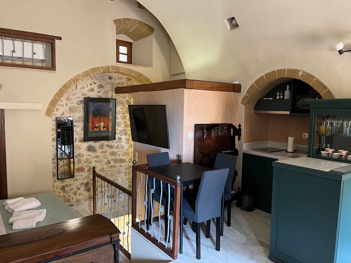 Deluxe-Studio mit Küchenzeile, Bad und eigenem Innenhof. Teil eines alten Herrenhauses aus dem 18. Jahrhundert. Kürzlich renoviert, damit es bequem Platz für bis zu vier Personen bietet. Im Zentrum der Insel Spetses. Fünf Minuten zu Fuß vom Haupthafen aus erreichbar. Fünf Gehminuten von den meisten Sehenswürdigkeiten (Hauptmarkt, Restaurants, Bars, Museen, Agios Mamas Beach) entfernt.