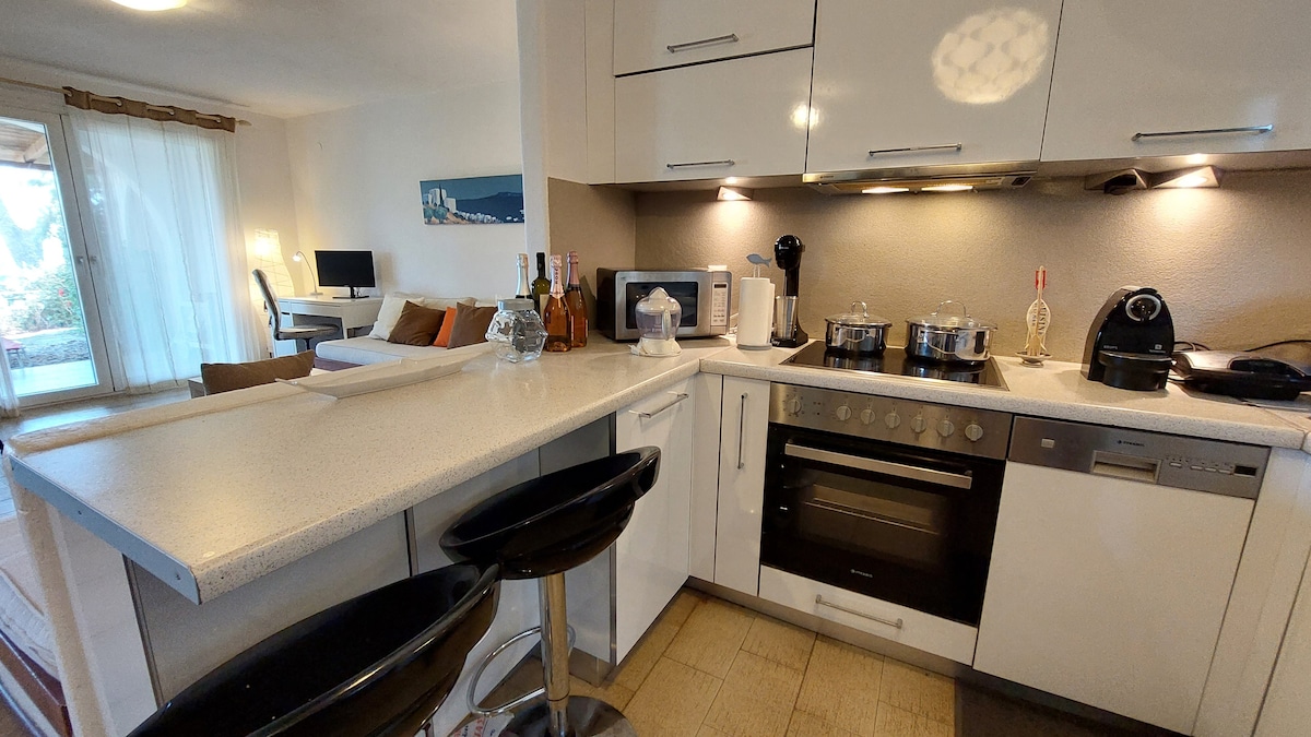 Luxury stylish studio, 2nd floor, 30 sqm, Seaview, furnished, fully renovated in 2022: marble floor, aluminum frames, electric blinds, electric tent, equipped kitchen, air condition, anatomic mattress, lighting with remote control, shower panel tower, electric tower rail, USB chargers, smart TV, Wi-Fi, Netflix, many extras, washing machine and dryer (located at the ground floor of the building). The property is 5 mins walk from the beach, the last 70 meters are uphill. Ideal for teleworking.