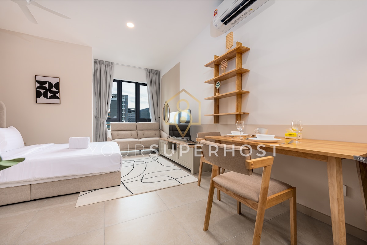 Unsere brandneue gemütliche Suite befindet sich im Herzen von Penang mit einfachem Zugang zu lokalen Sehenswürdigkeiten. Japanische/koreanische Restaurants und der 7-11 Convenience Store befinden sich direkt unter unserer Unterkunft! Lokales Essen, KFC & Pizza Hut sind innerhalb von 5 Gehminuten erreichbar! Wir bieten • hervorragende Gastfreundschaft • Sonnenaufgang & Blick auf die Stadt • PS3-Unterhaltung und Netflix • 1 Privatparkplatz • 100 Mbit/s WLAN • Blick auf den Infinity-Pool • Vollklimatisiert Wenn du einen ruhigen und gemütlichen Ort in dieser lebhaften Stadt magst, warte nicht, sondern buche jetzt!!!