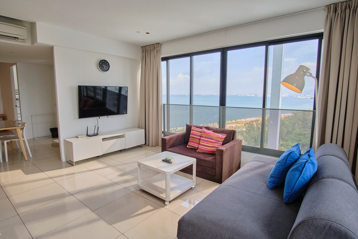 Maritime Suiten von Comfy Penang • 5-STERNE-SUPERHOST • 180° PANORAMABLICK AUF DAS MEER • Blick auf den SONNENAUFGANG • Blick auf die Penang Bridege • 120 Quadratmeter • 2 Privatparkplätze • 200 Mbit/s WiFi • 30 Restaurants, Cafés, Pubs, Starbucks, Kaffeebohne, FamilyMart, 7-Eleven befinden sich auf Ebene 2 unseres Hauses • Komplett klimatisiert • 5 bis 10 Autominuten von Chew Jetty und der Altstadt, die zum UNESCO-Weltkulturerbe gehört, entfernt.