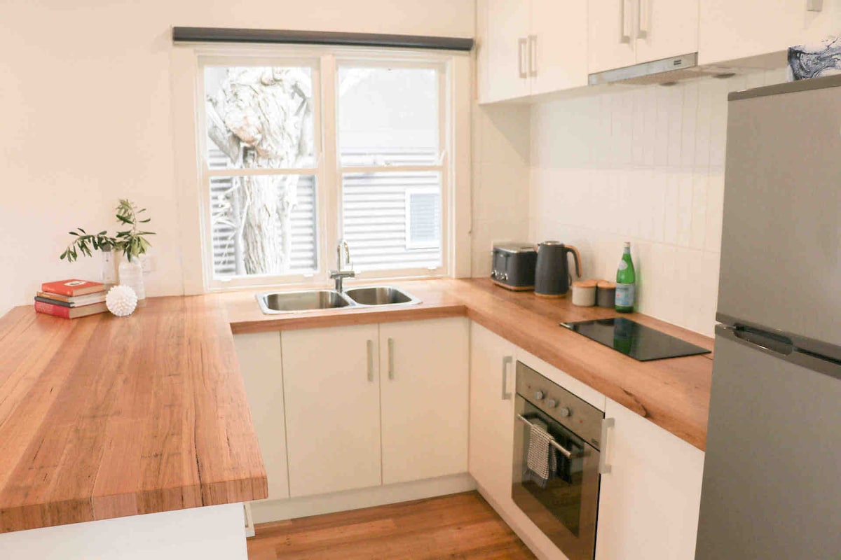Cozy one bedroom beach cottage, 100mts from ocean. Nestled in private fully fenced garden featuring outdoor sunken bath. Fully equipped kitchen, log gas fire, Living and bedroom open out onto deck area. -All linen provided -Selection of tea & coffee -Coffee machine -Netflix - "ONE SMALL" dog to be approved prior to booking. * Higher Rate applies for one night stays*