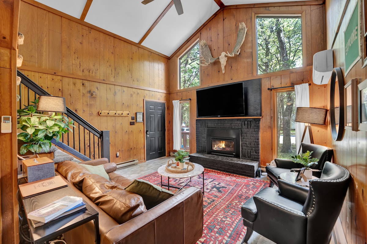 Entfliehe in unsere charmante 2-Zimmer-Blockhütte, die wunderschön mit modernem, gemütlichem Touch gestaltet ist. Genieße den Whirlpool, den Außenfernseher und den Grill auf der hinteren Terrasse. Der geräumige Garten bietet Platz für Spiele und Entspannung. Der offene Wohnbereich verfügt über einen Holzkamin, ein Esszimmer, eine Küche und einen Wintergarten mit einem Plattenspieler. Das atemberaubende Badezimmer verfügt über eine freistehende Badewanne und eine Dusche. Beide Schlafzimmer mit Queensize-Betten verfügen über Schränke für deine Bequemlichkeit. In der Nähe der wichtigsten Pocono-Attraktionen – Jim Thorpe und die Berge