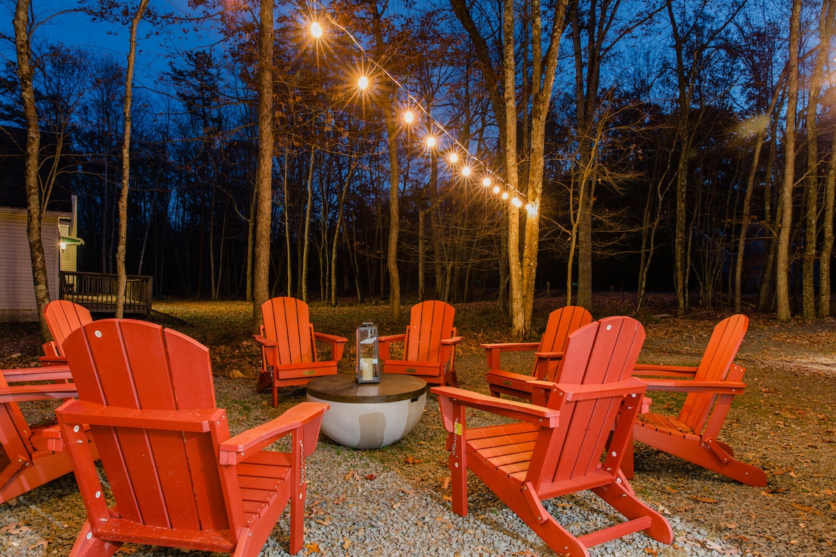 Ein wahrer Bergurlaub! Die BLVE Cabin liegt in der Nähe von Bushkill Falls & Shawnee Mountain. Platz für 8 Personen mit 3 Queensize-Betten und einem Schlafsofa. Genießen Sie die offene Küche und den Wohnbereich mit elektrischem Kamin und Blick auf die Natur. Das Hauptdeck bietet einen Grill, einen Fernseher im Freien und eine Gasfeuerstelle. Das Unterdeck verfügt über einen Whirlpool mit Holzfeuerung. Spielzimmer mit Pelletofen, Projektor, Tischtennis und Brettspielen. Draußen kannst du dich an der echten Holzfeuerstelle entspannen, in der Hängematte schaukeln und die friedliche Bergstimmung genießen.
