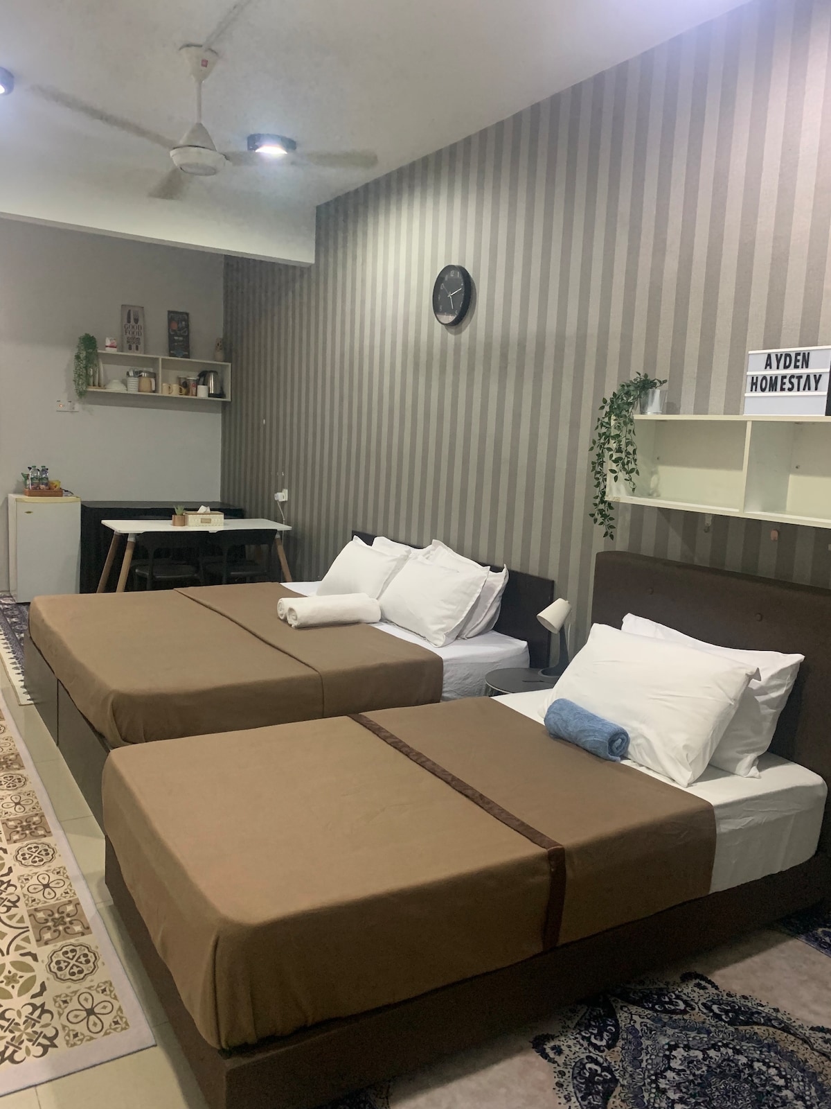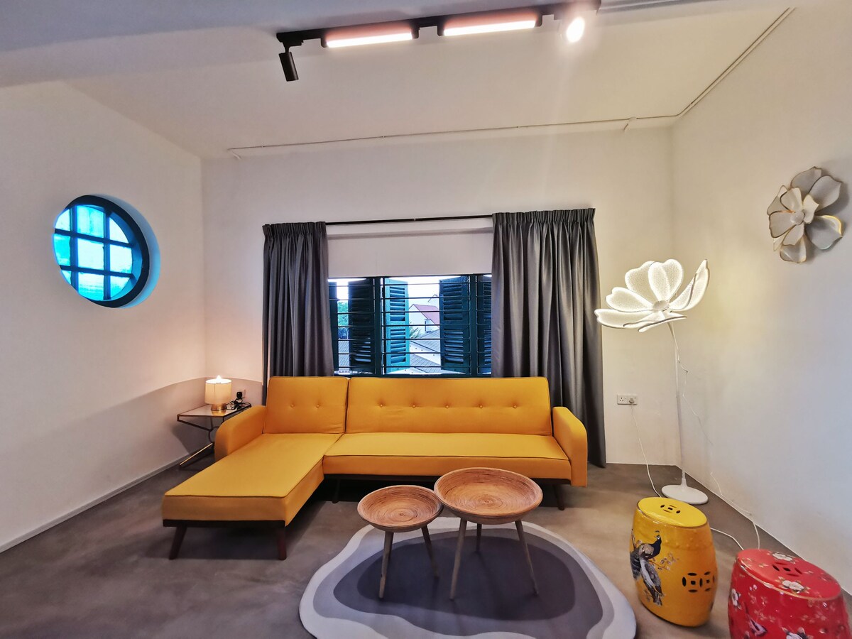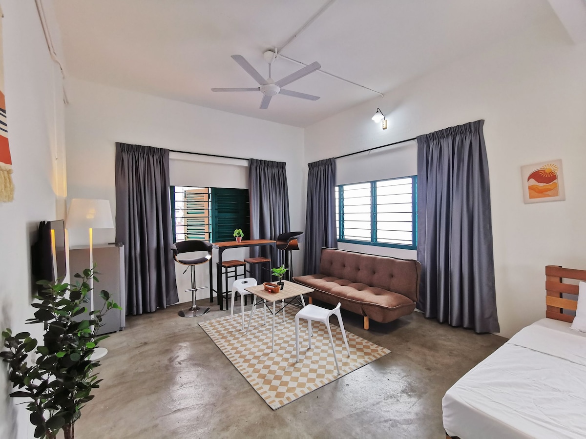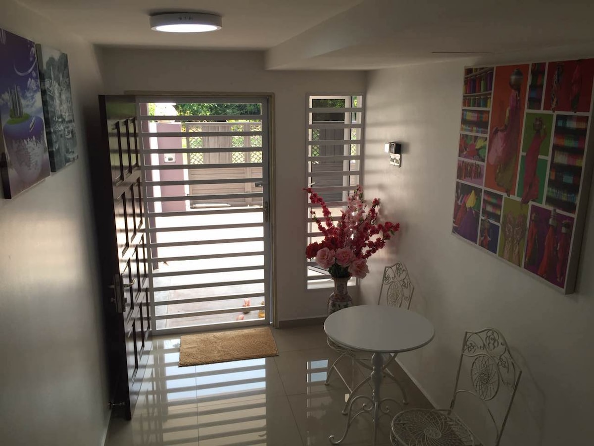 Dies ist eine Suite mit Wohnzimmer + Schlafzimmer + angeschlossenem Bad. Du musst an keinem gemeinsam genutzten Wohnraum vorbeigehen, um ins Schlafzimmer zu gelangen (nur der Flur wird mit anderen Gästen geteilt). Die Türen sind durch ein intelligentes Türschloss für den selbstständigen Check-in und Check-out gesichert. Unsere Unterkunft befindet sich in einem zentralen und ruhigen Viertel. Die Unterkunft ist geräumig und von viel Grün umgeben. Die Gäste können tagsüber Bequemlichkeit genießen [5 Minuten zum Flughafen, 10 Minuten mit dem Auto in die Altstadt und zur Ipoh Parade] und nachts einen ruhigen, erholsamen Aufenthalt haben.