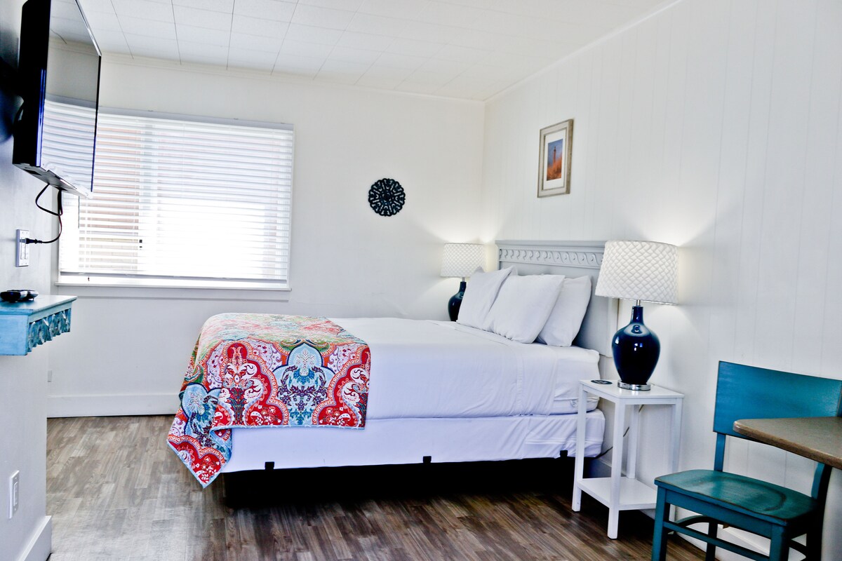 Studio unit; Completely Redone Winter of 2017. Originally a classic 1950's beachfront motel. Well furnished with new luxury queen bed, new sheets, new 40 inch HD flat screen TV, great WiFi, new fridge, new microwave, small 1950's bathroom with clean small walk in shower, new toilet and new sink. Guest controlled heat/air conditioning, new paint, and new flooring. Great location across Lakeshore Dr. from the award winning Ludington City Stearns Beach, North Breakwall, and Lighthouse. Seasonal heated outdoor pool. Only five blocks from Downtown Ludington with restaurants, shops, grocery store, and Sandcastles Children's Museum.