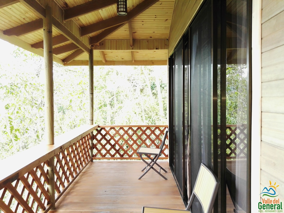 Es ist ein idealer Bungalow für Paare oder für Familien von 3 Mitgliedern. Sie ist von Wald umgeben und verfügt über eine möblierte Terrasse mit Panoramablick auf das Tal von El General. Sie ist perfekt für ein Glas Wein. Du hast Zugang zu Wanderwegen, Restaurants, Baldachin-Touren und ATV (Block).