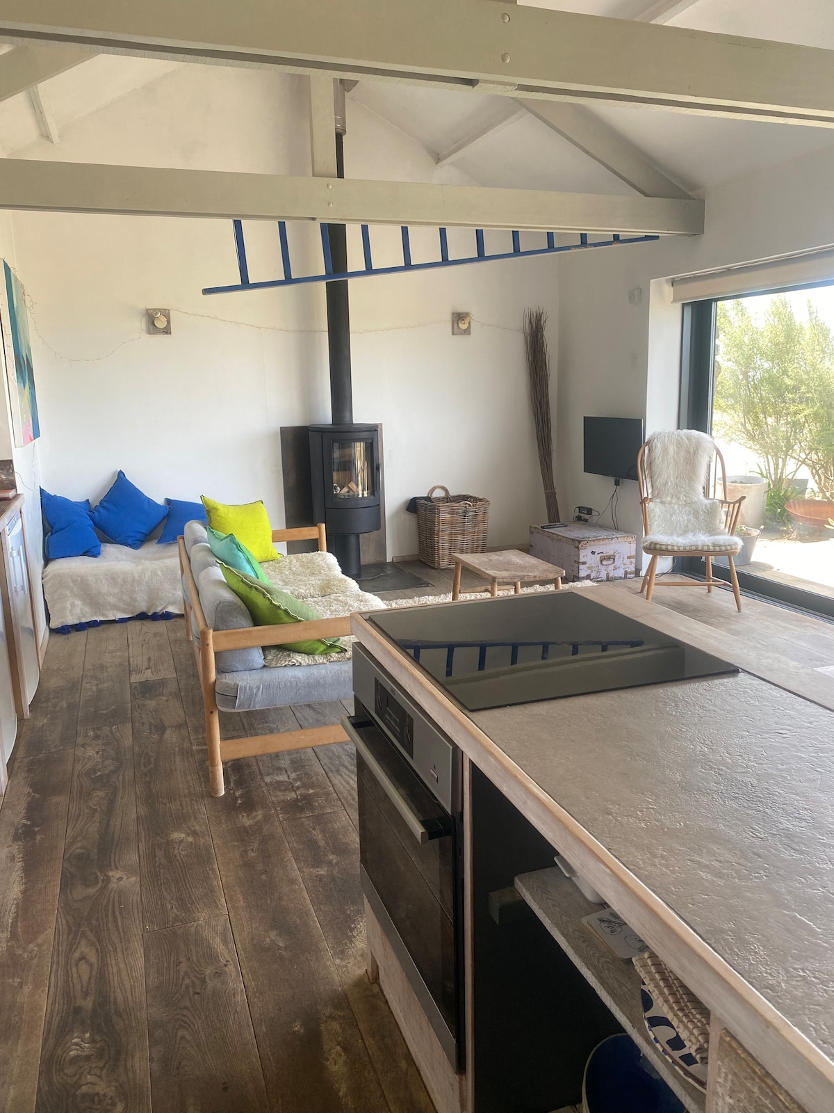Das Salty ist eine wunderschöne moderne, renovierte Scheune in spektakulärer Küstenlage mit Panoramablick auf die Mounts Bay und den St. Michael's Mount. Der Wohn-/Ess-/Küchenbereich ist luftig und geräumig mit einem großen Panoramafenster, das vollständig geöffnet werden kann. Versuche, den Esstisch vor das Fenster zu stellen und eine herrliche malerische Mahlzeit zu genießen. Wenn es kalt ist, hilft die Dreifachverglasung, es warm zu halten und die Fußbodenheizung und der brüllende Holzofen helfen, das Bild zu vervollständigen.