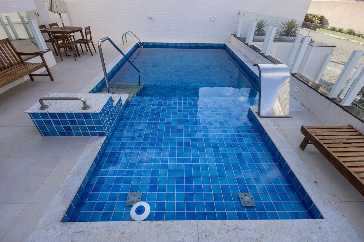 Flat p/ Família até 8 pessoas a 250mts da praia totalmente protegido c/ tela mosquiteiro c/ 1 suíte c/ cama de casal e ar condicionado, 1 dormitório c/ cama de casal e beliche, 1 quarto compacto c/ treliche, mais 2 colchões de solteiro avulso, amplos terraços, sala Living c/ wifi e stremming, terraço com churrasqueira, 2 TV's a cabo/Sinal aberto, um excelente local c/ uma belíssima vista panorâmica e ótima ventilação, garagem coberta para 2 carros, segurança 24Hs, acesso ao Flat por elevador..