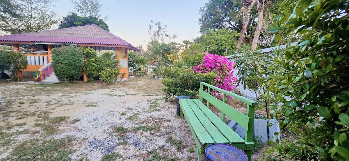 .My house is a cozy single-story home surrounded by greenery and nature. It is located in a peaceful area near the beach, offering a calm and relaxing atmosphere. The house is slightly elevated with a small staircase leading to the entrance.