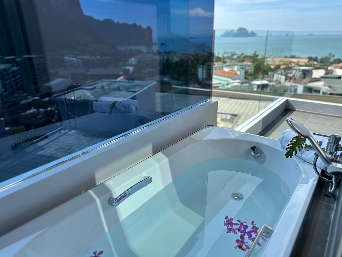 Discover extraordinary relaxation at our stunning 4th-floor penthouse in Krabi. This private, self-contained residence offers a refreshing coastal atmosphere, blending modern luxury with tropical charm—perfect for romance or quiet retreats. You'll love the private plunge pool with Jacuzzi on your balcony, unwind in the comfortable living room. Enjoy cooking in the stylish, modern kitchen, ideal for self-catering or local dining. This spacious penthouse perfectly blends comfort and relaxation.